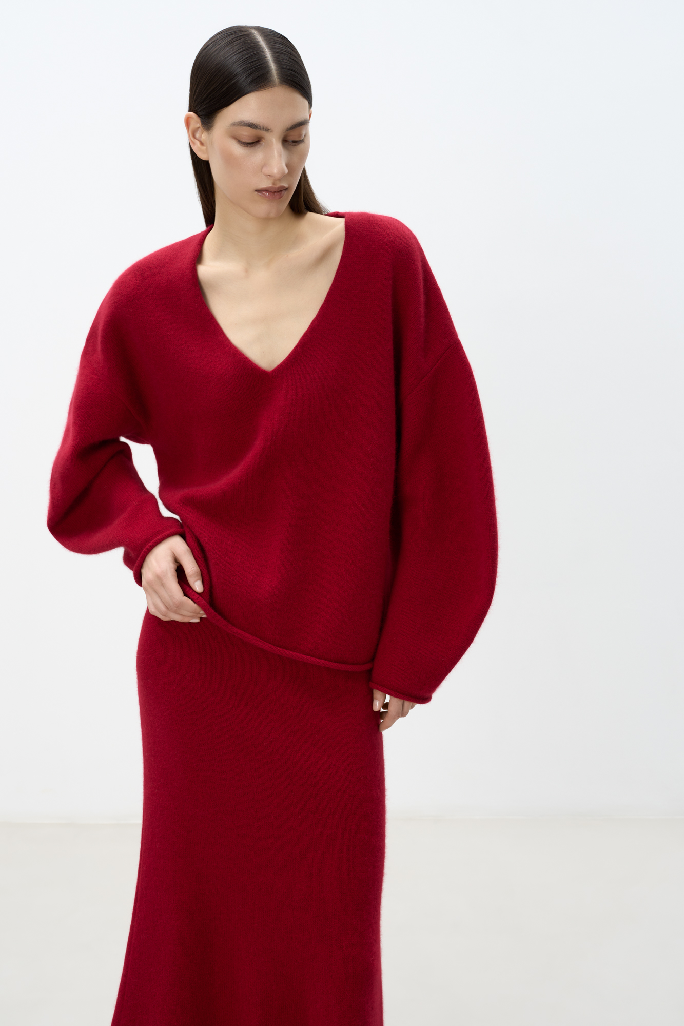 Объемный трикотажный джемпер из пуха лисы. Модель с глубоким V-образным вырезом горловины, спущенной линией плеч, длинными широкими рукавами и валиками по низу. Дополнить образ можно юбкой.