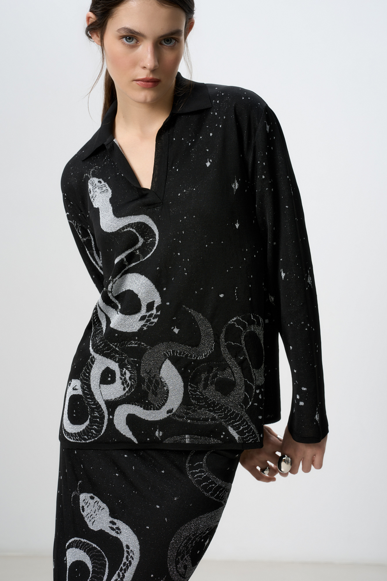 Трикотажный джемпер из вискозы с добавлением люрекса. Модель свободного силуэта с длинным рукавом, отложным воротником и V-образным вырезом. Изделие декорировано жаккардовым рисунком в виде переплетающихся змей.