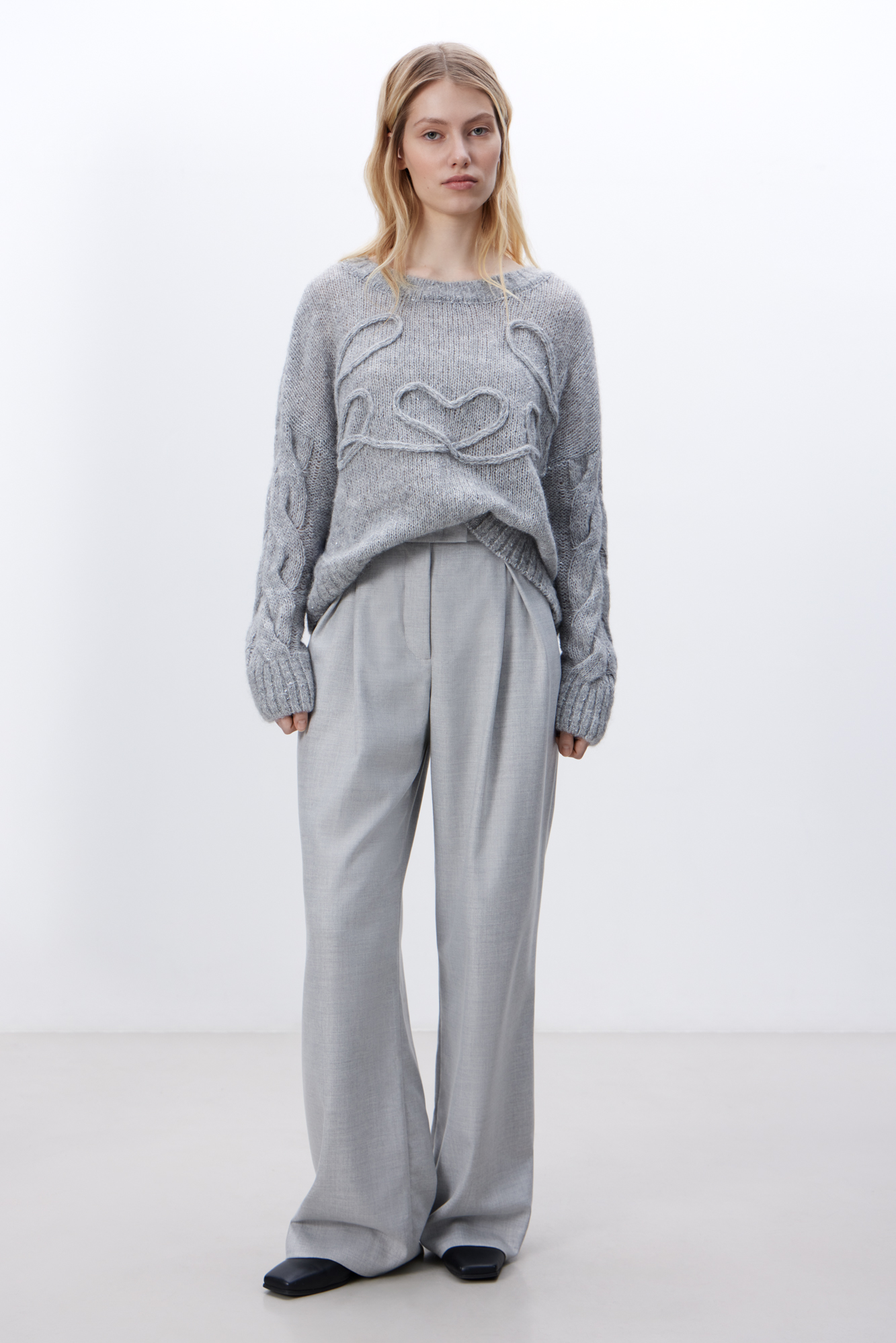 Трикотажный джемпер из шерсти альпака с добавлением люрекса. Модель свободного силуэта со спущенной линией плеча и круглым вырезом горловины. Изделие декорировано вывязанными косами на рукавах и вензелем на груди.