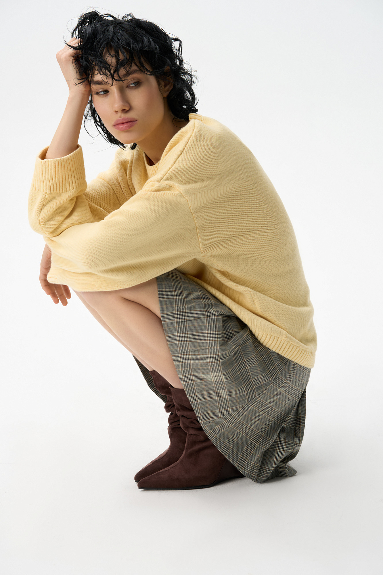 Трикотажный джемпер из 100% хлопка. Модель свободного силуэта со спущенной линией плеч и круглым вырезом горловины. Края изделия выполнены в рубчик. Дополнить образ можно юбкой.