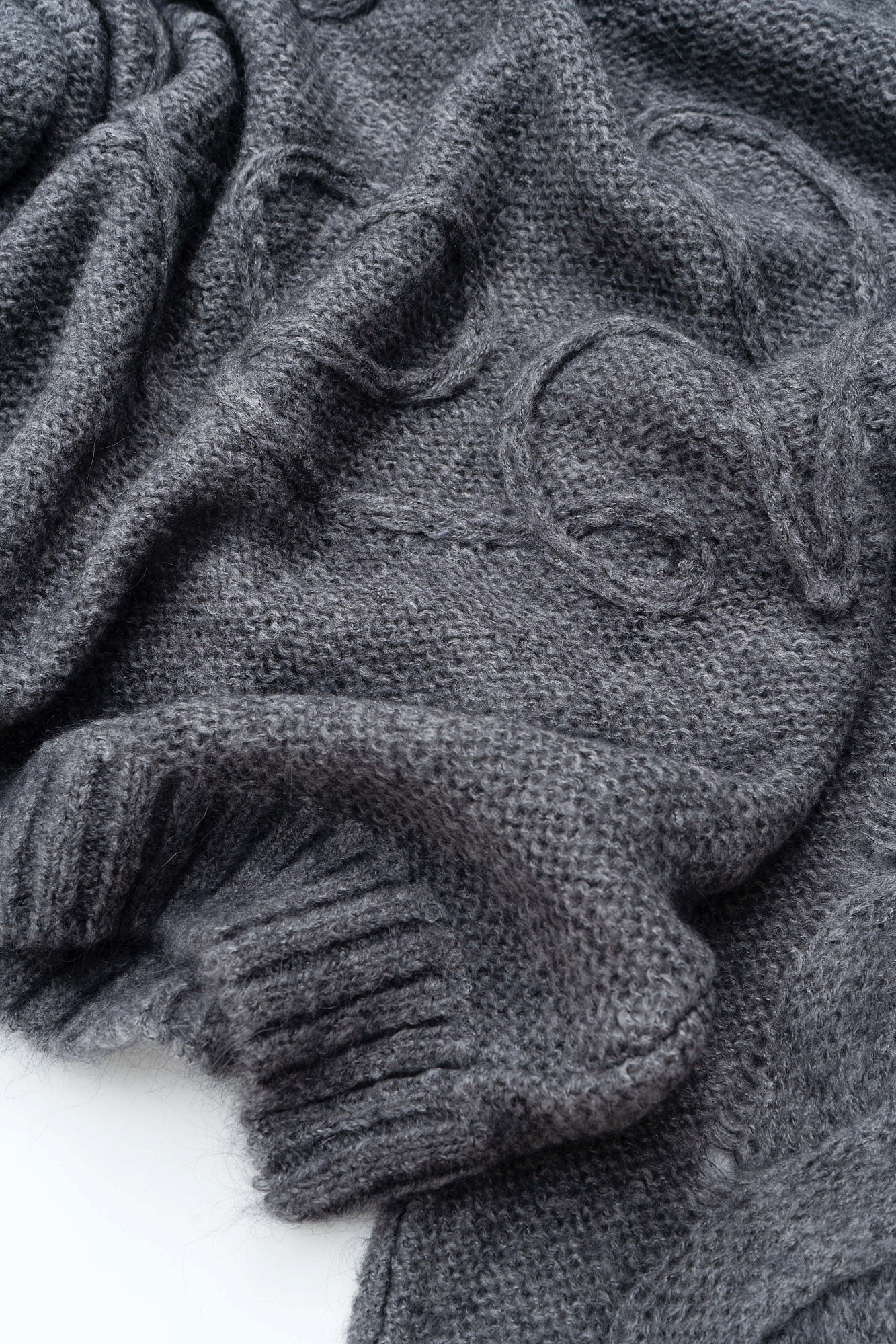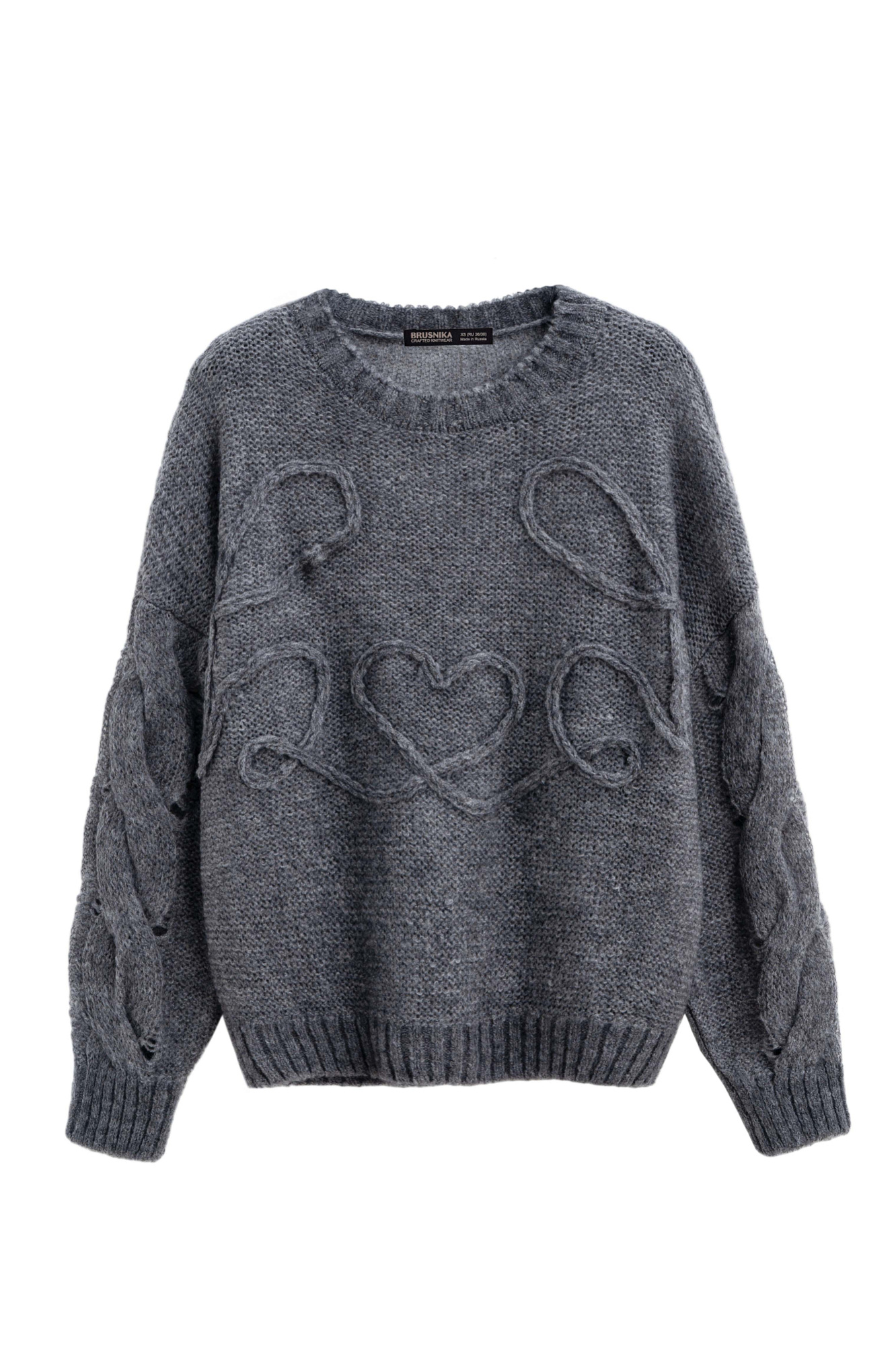 Трикотажный джемпер из шерсти и мохера. Модель свободного силуэта со спущенной линией плеча и круглым вырезом горловины. Изделие декорировано вывязанными косами на рукавах и вензелем в виде сердца на груди.
