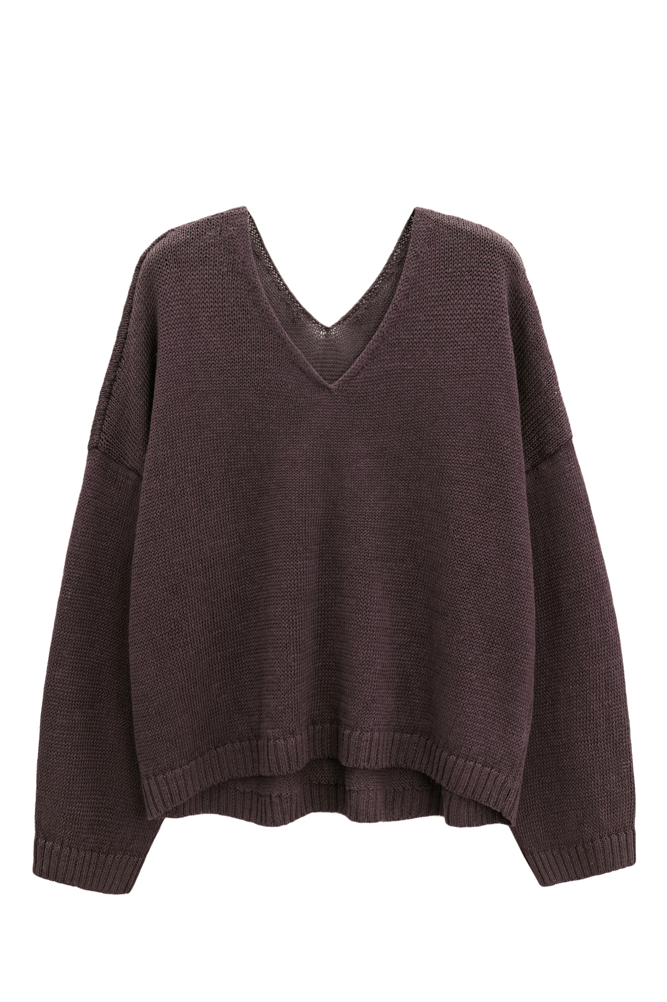 Трикотажный джемпер из 100% льна с V-образным вырезом. Модель прямого силуэта с длинным рукавом и удлиненной спинкой. Края изделия выполнены в рубчик.