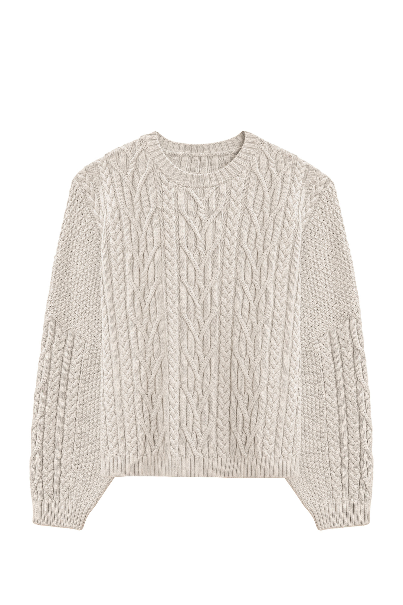 Трикотажный джемпер из вискозы и хлопка. Модель свободного силуэта со спущенной линией плеч, объемными рукавами и круглым вырезом горловины. Изделие декорировано фактурной вязкой в виде кос разной толщины. Края выполнены в рубчик.