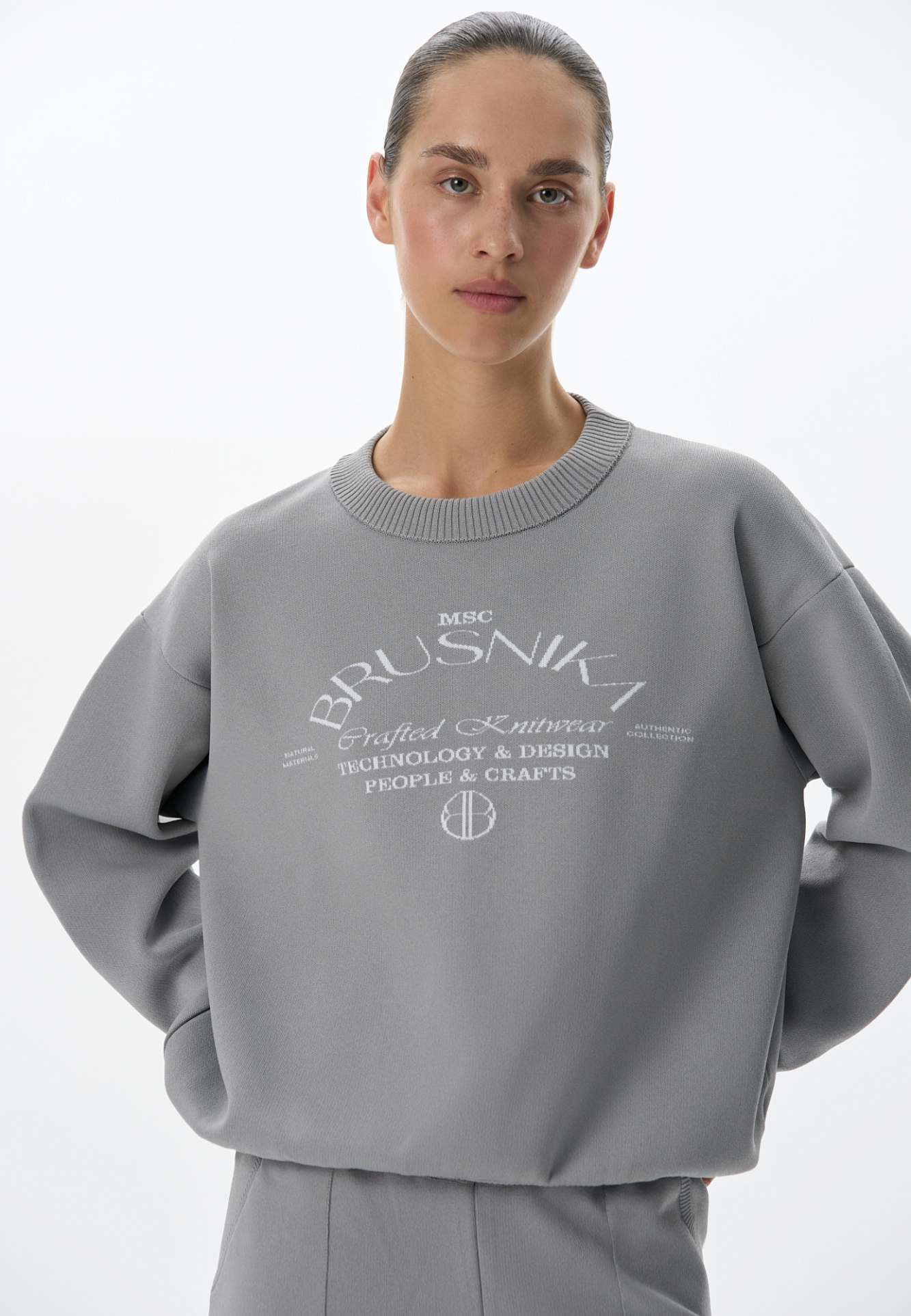 Трикотажный джемпер из вискозы. Модель свободного силуэта, с длинными рукавами, спущенной линией плеч и круглым вырезом горловины. Края выполнены в рубчик. Изделие декорировано брендированным жаккардом.