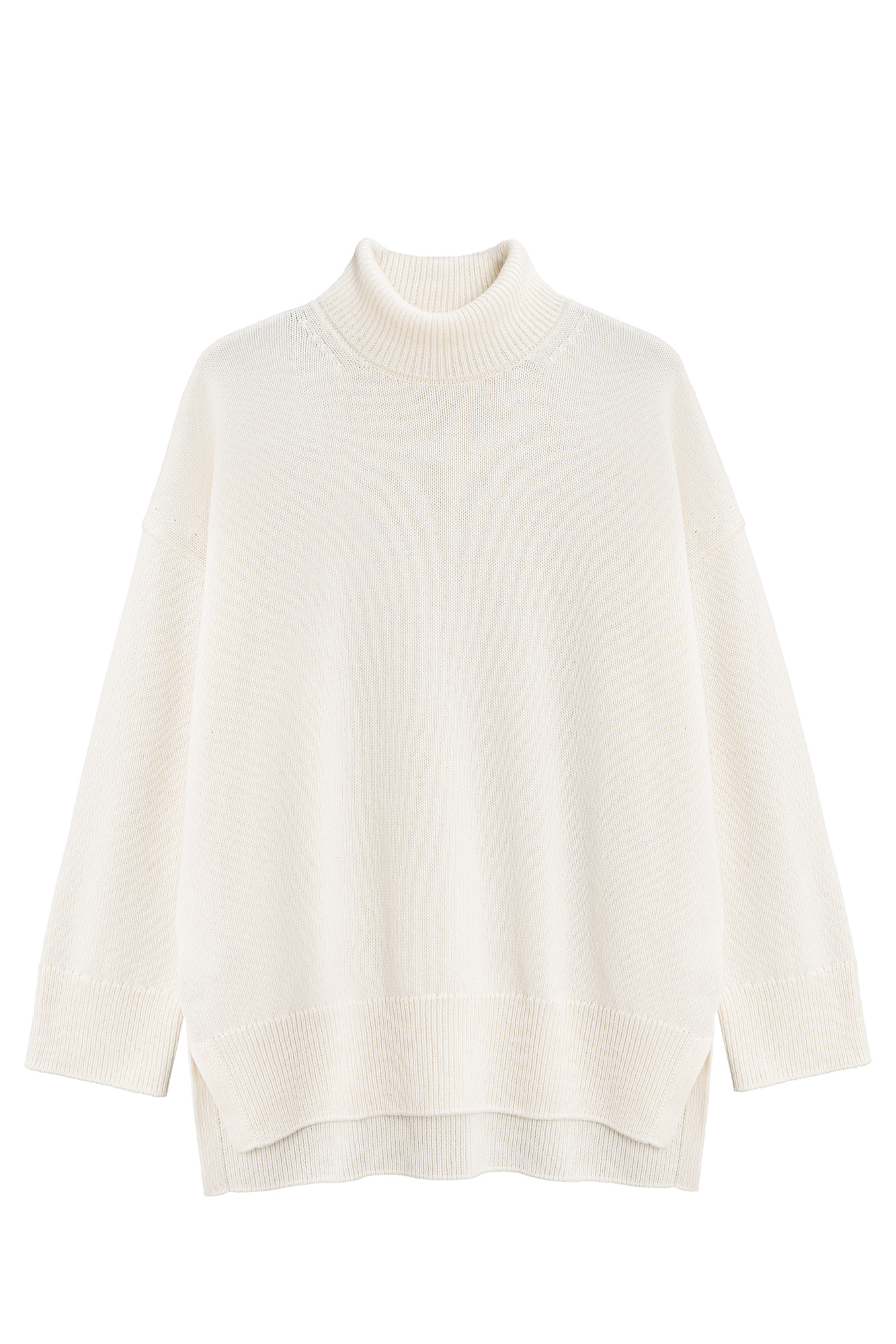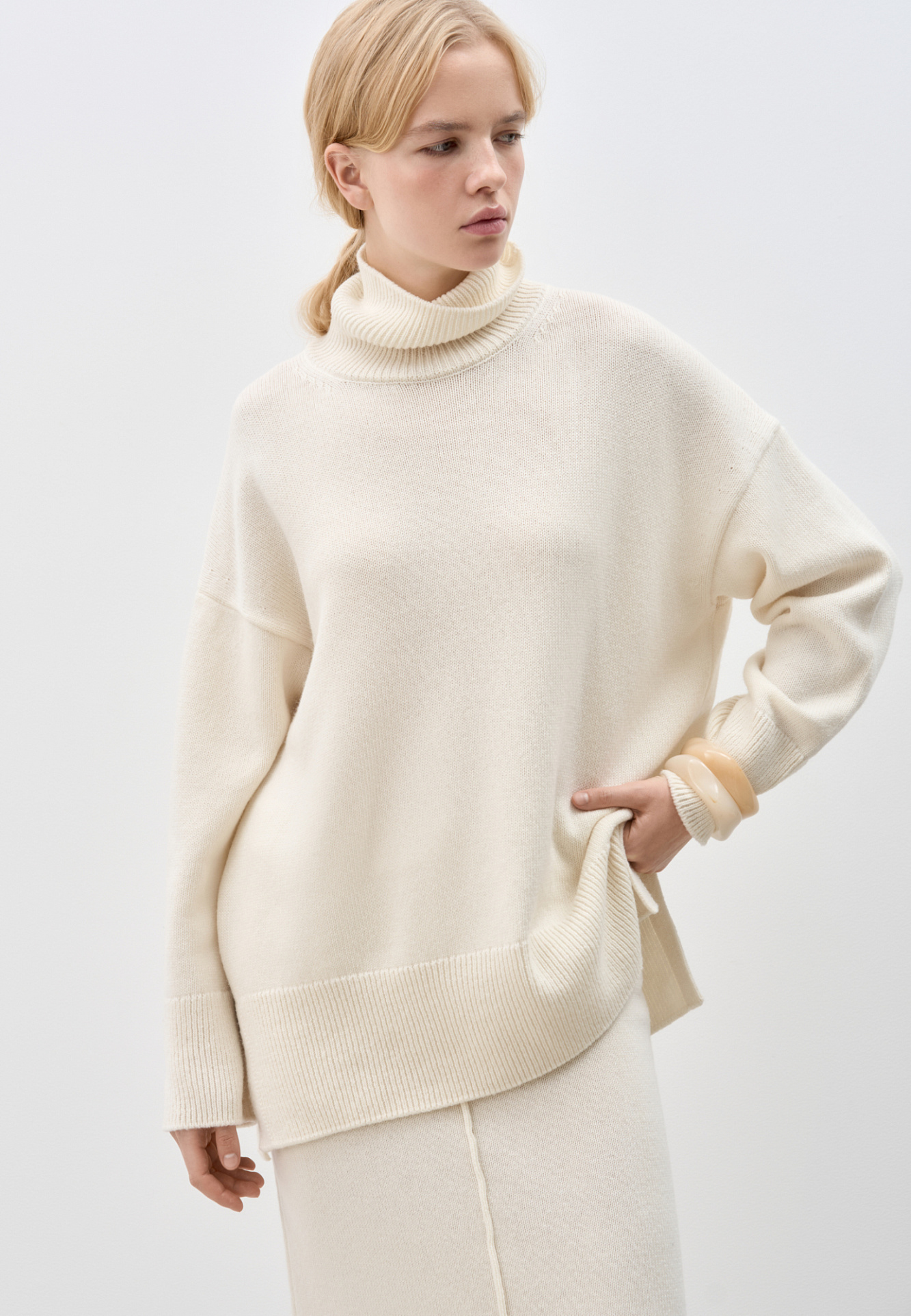 Трикотажный джемпер из кашемира и шерсти. Модель свободного силуэта, со спущенной линией плеч и высоким вывязанным воротом. Манжеты рукавов и низ изделия выполнены в рубчик.