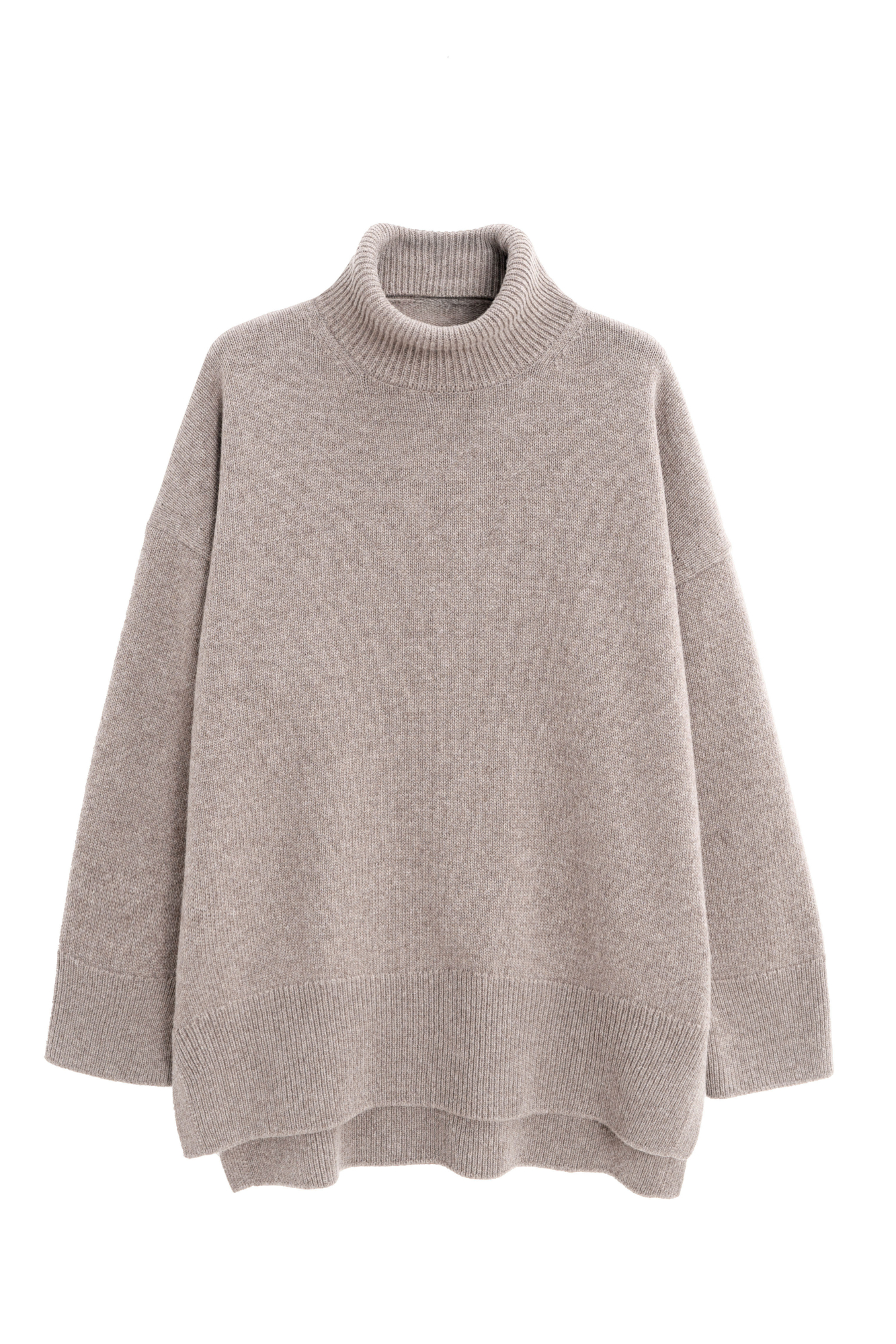Трикотажный джемпер из кашемира и шерсти. Модель свободного силуэта, со спущенной линией плеч и высоким вывязанным воротом. Манжеты рукавов и низ изделия выполнены в рубчик.