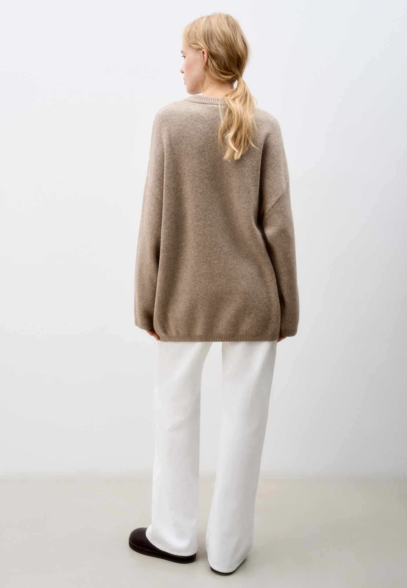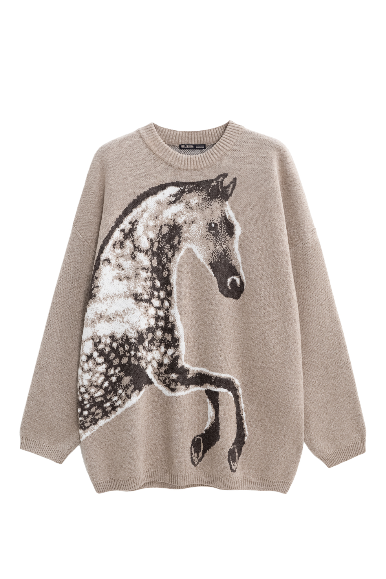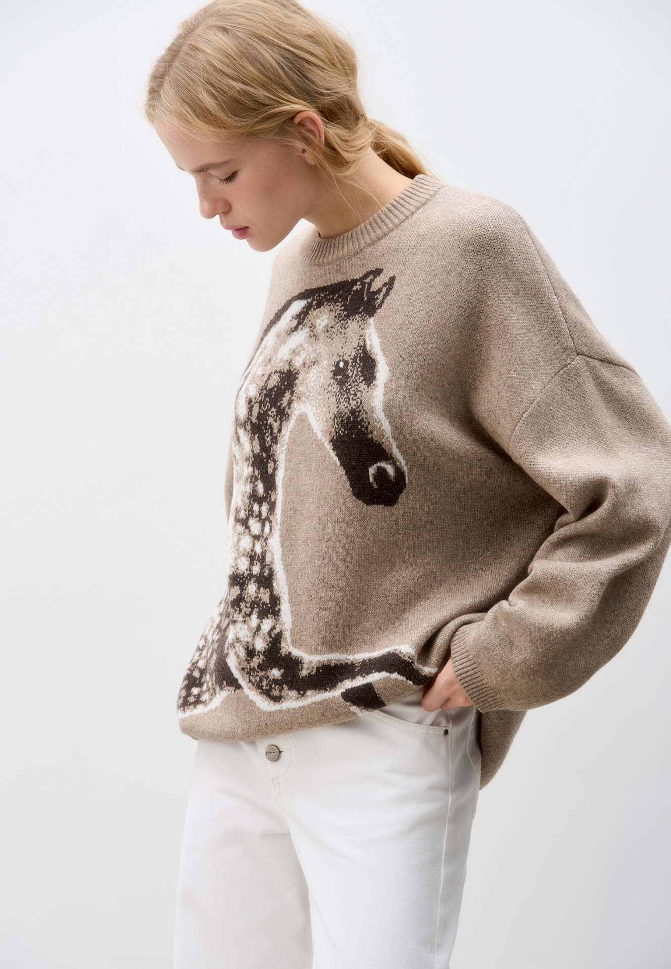 Трикотажный джемпер из шерсти и кашемира. Модель свободного силуэта со спущенной линией плеч, круглым вырезом горловины и жаккардовым анималистичным принтом лошади. Края изделия выполены в рубчик.