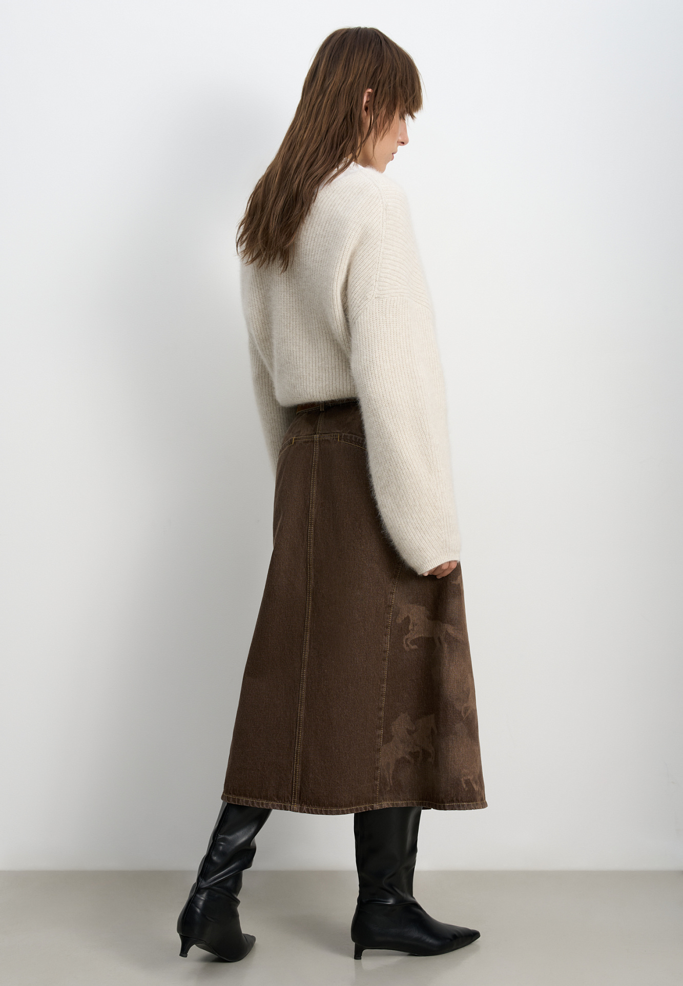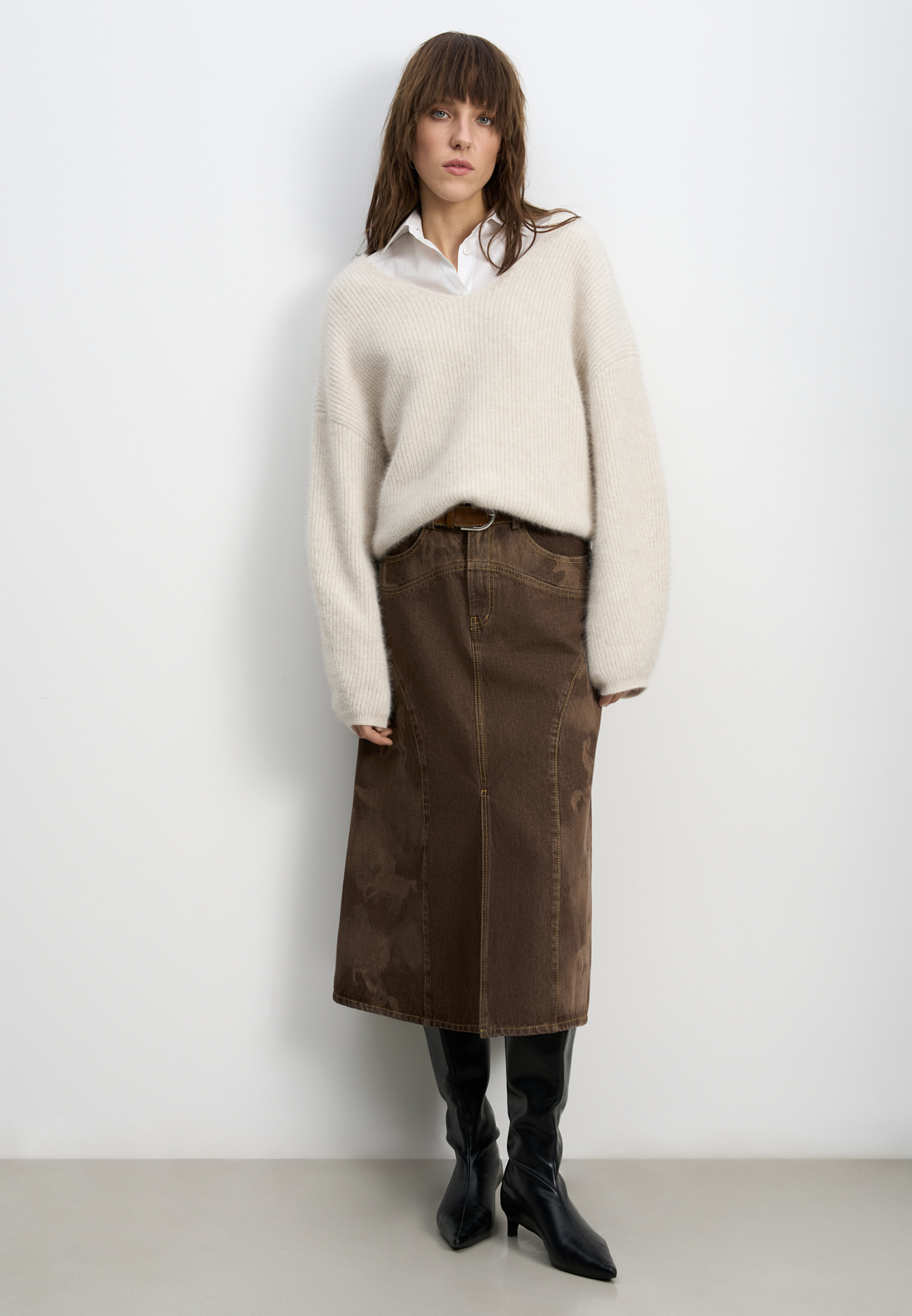 Трикотажный джемпер из пуха лисы. Модель свободного силуэта со спущенной линией плеч и V-образным вырезом горловины. Образ можно дополнить юбкой в том же стиле.
