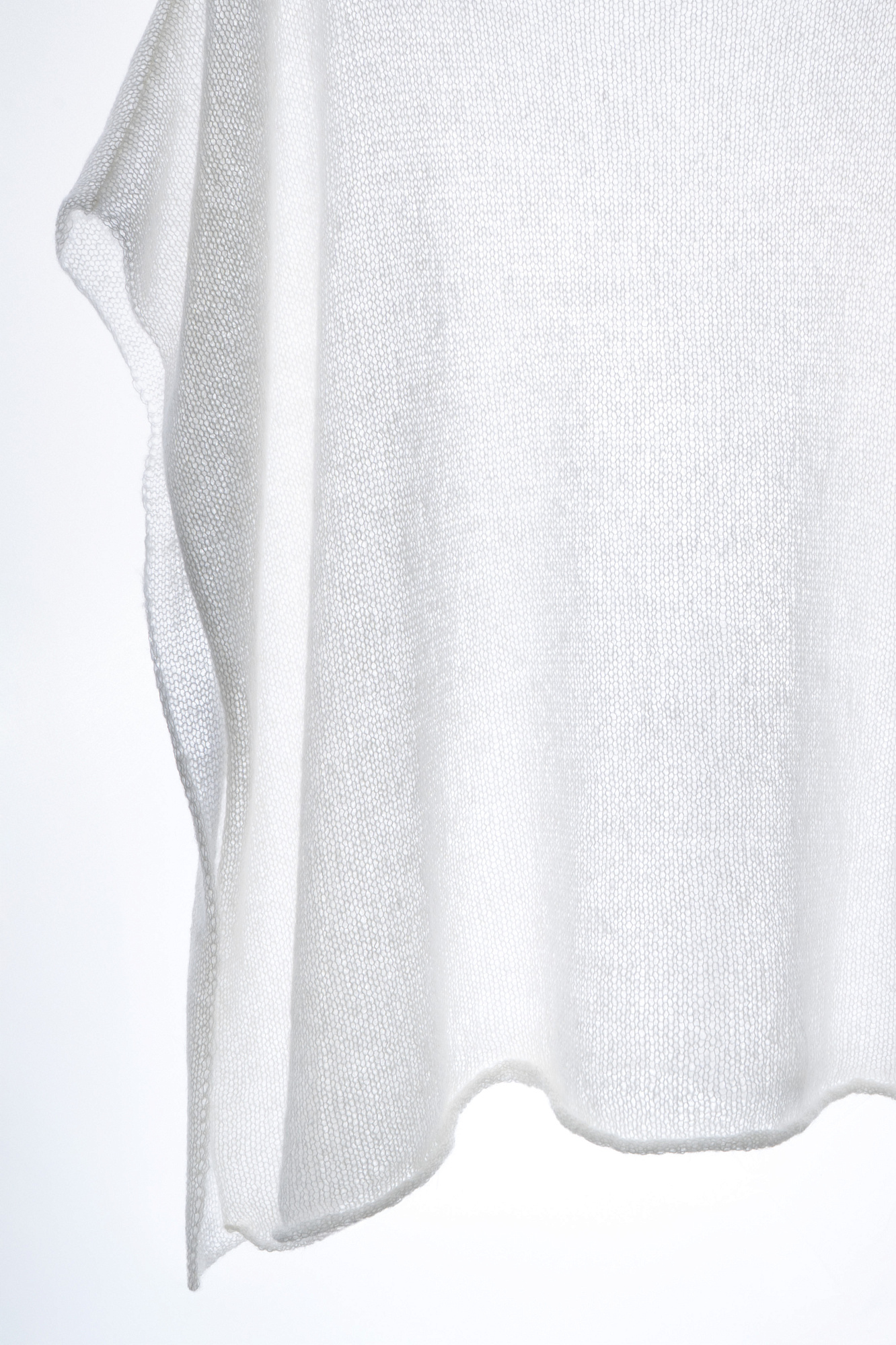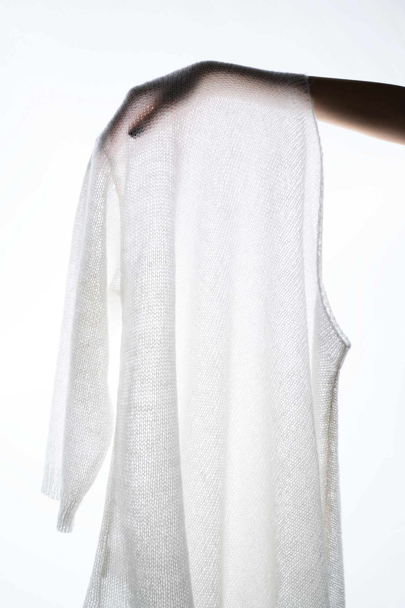 Полупрозрачный трикотажный джемпер из шерсти с добавлением мохера. Модель ассиметричного силуэта с одним длинным рукавом и круглым вырезом горловины.