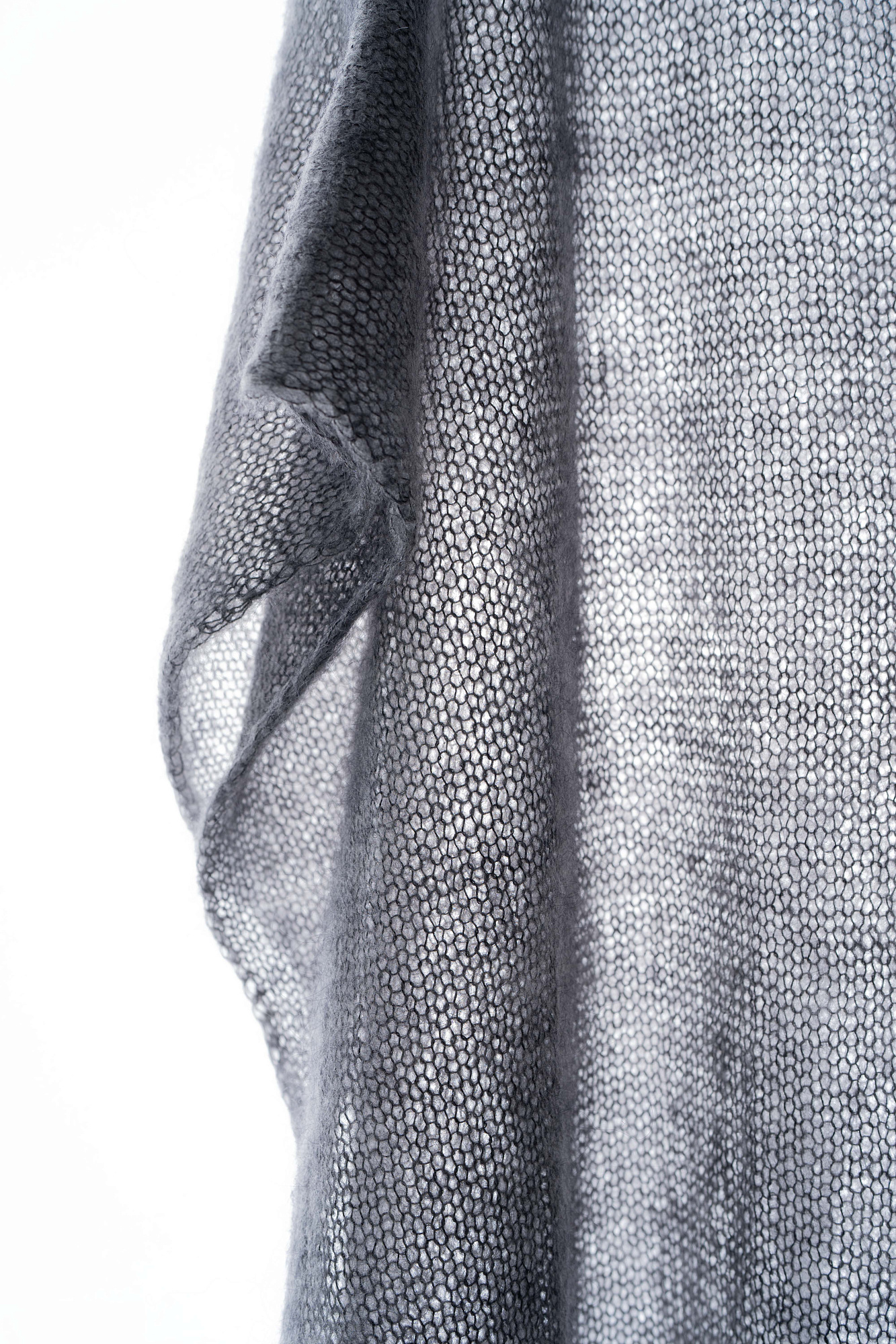 Полупрозрачный трикотажный джемпер из шерсти с добавлением мохера. Модель ассиметричного силуэта с одним длинным рукавом и круглым вырезом горловины.