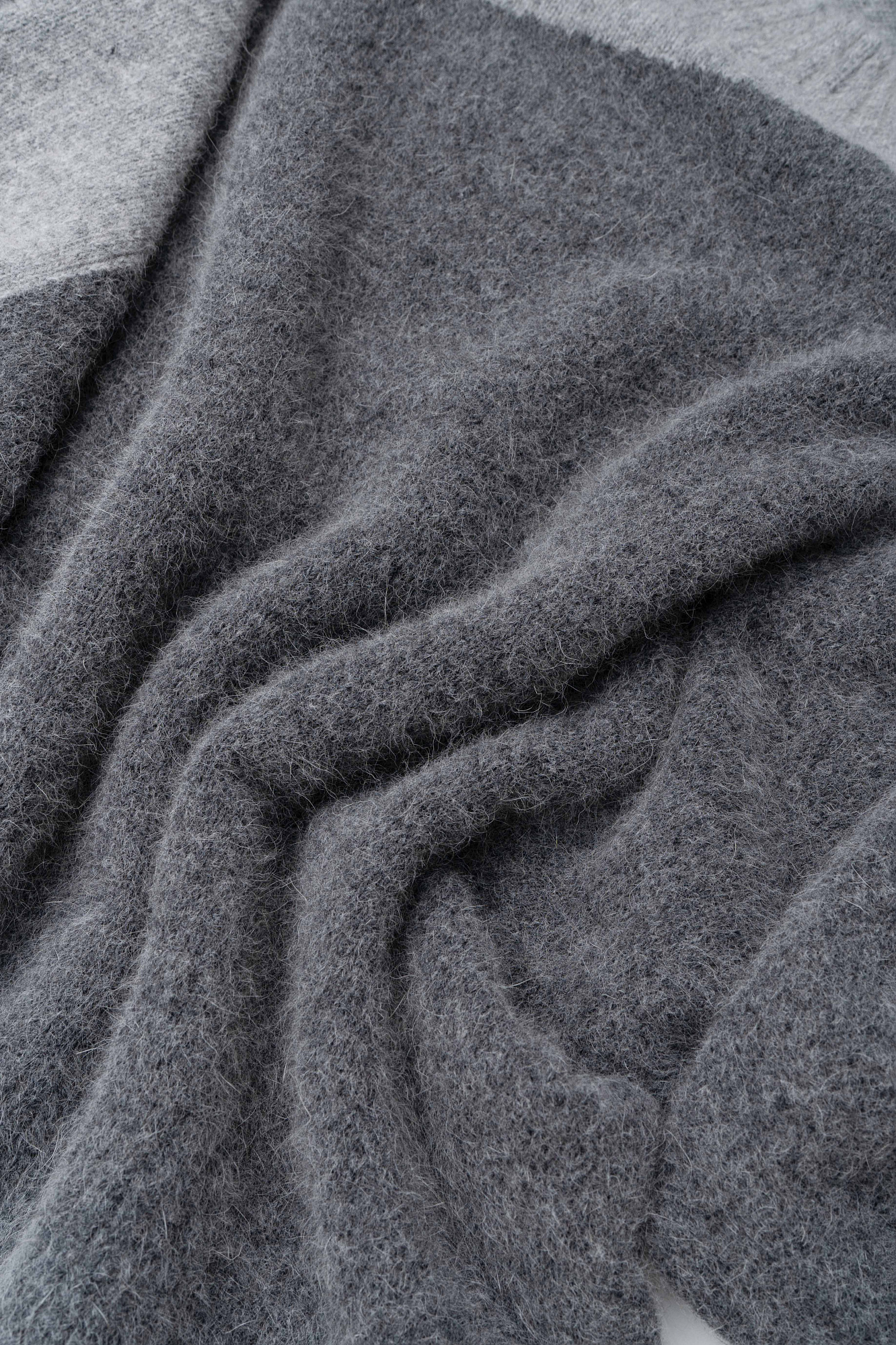 Двуцветный трикотажный джемпер из пуха лисы. Модель свободного силуэта, со спущенной линией плеч и круглым вырезом горловины. Края изделия выполнены в рубчик.