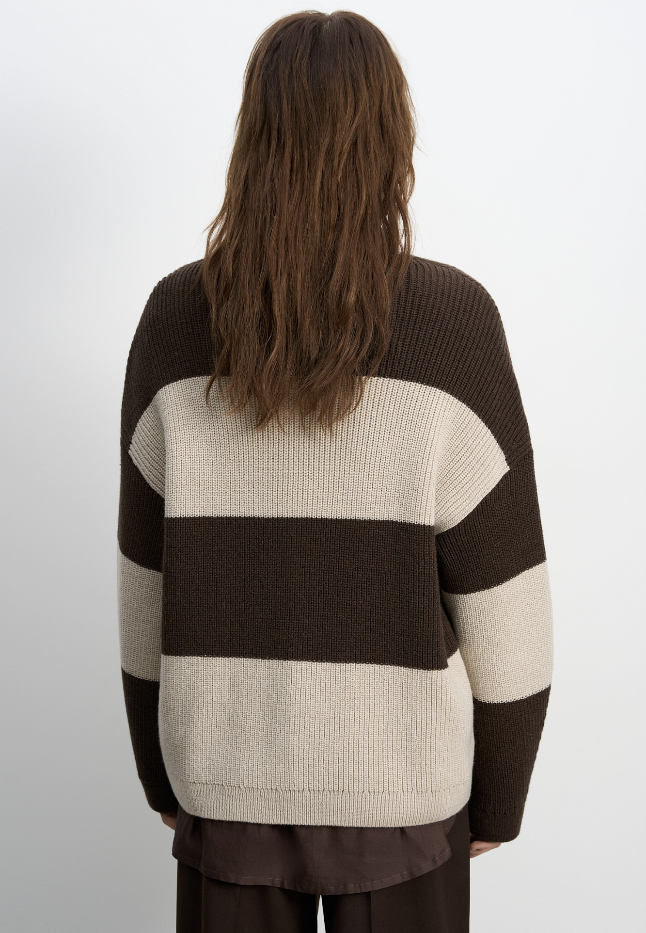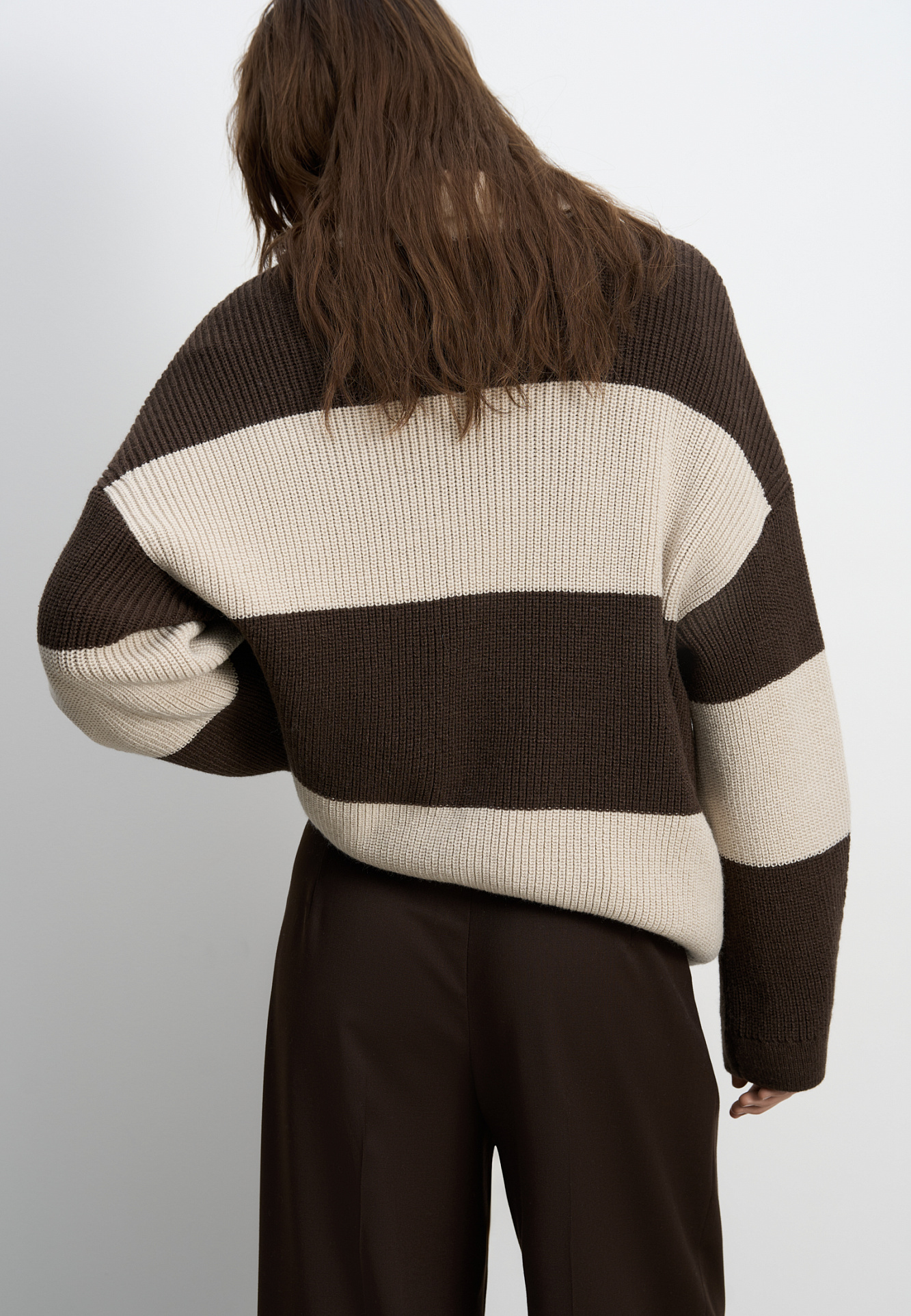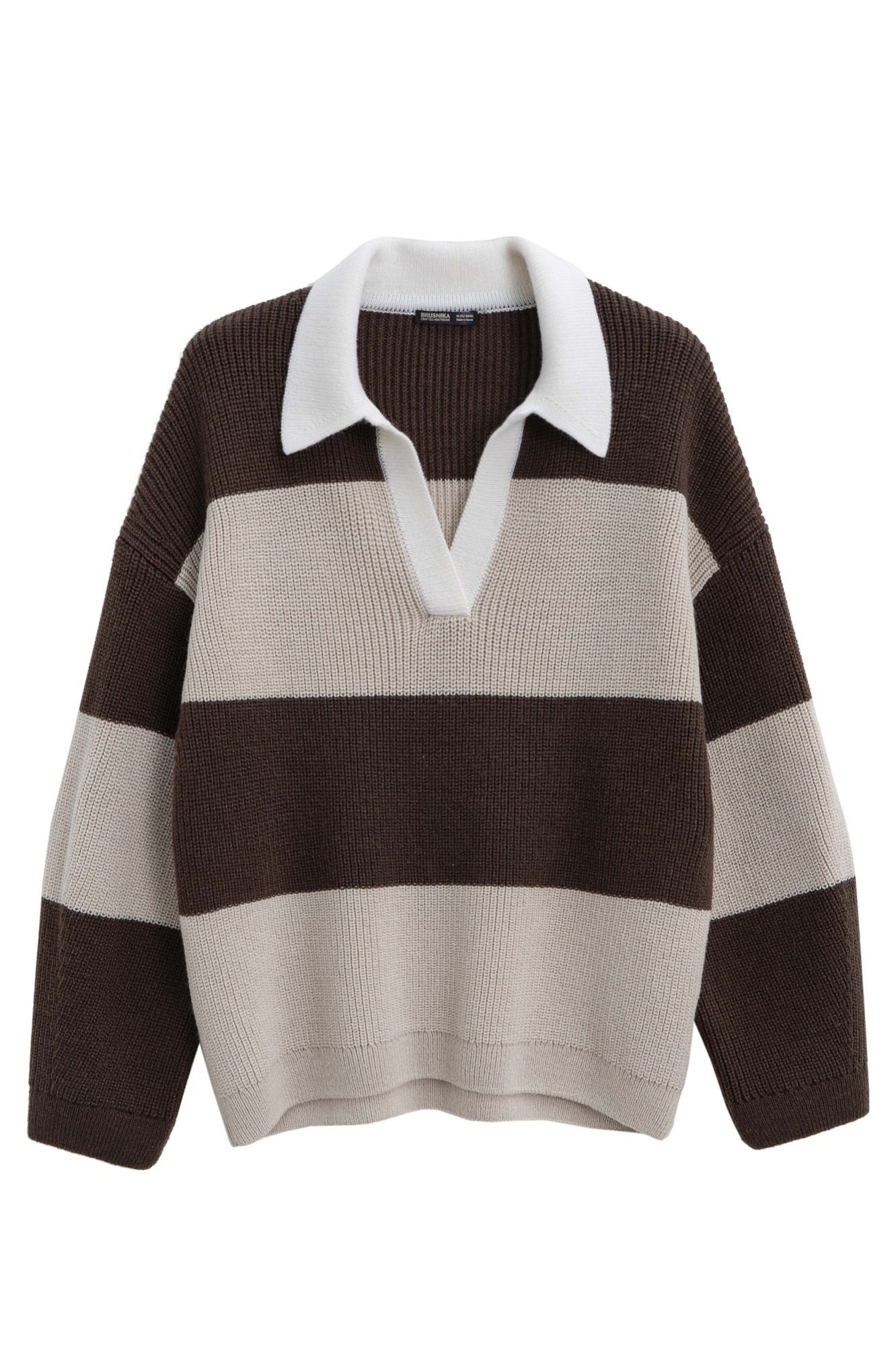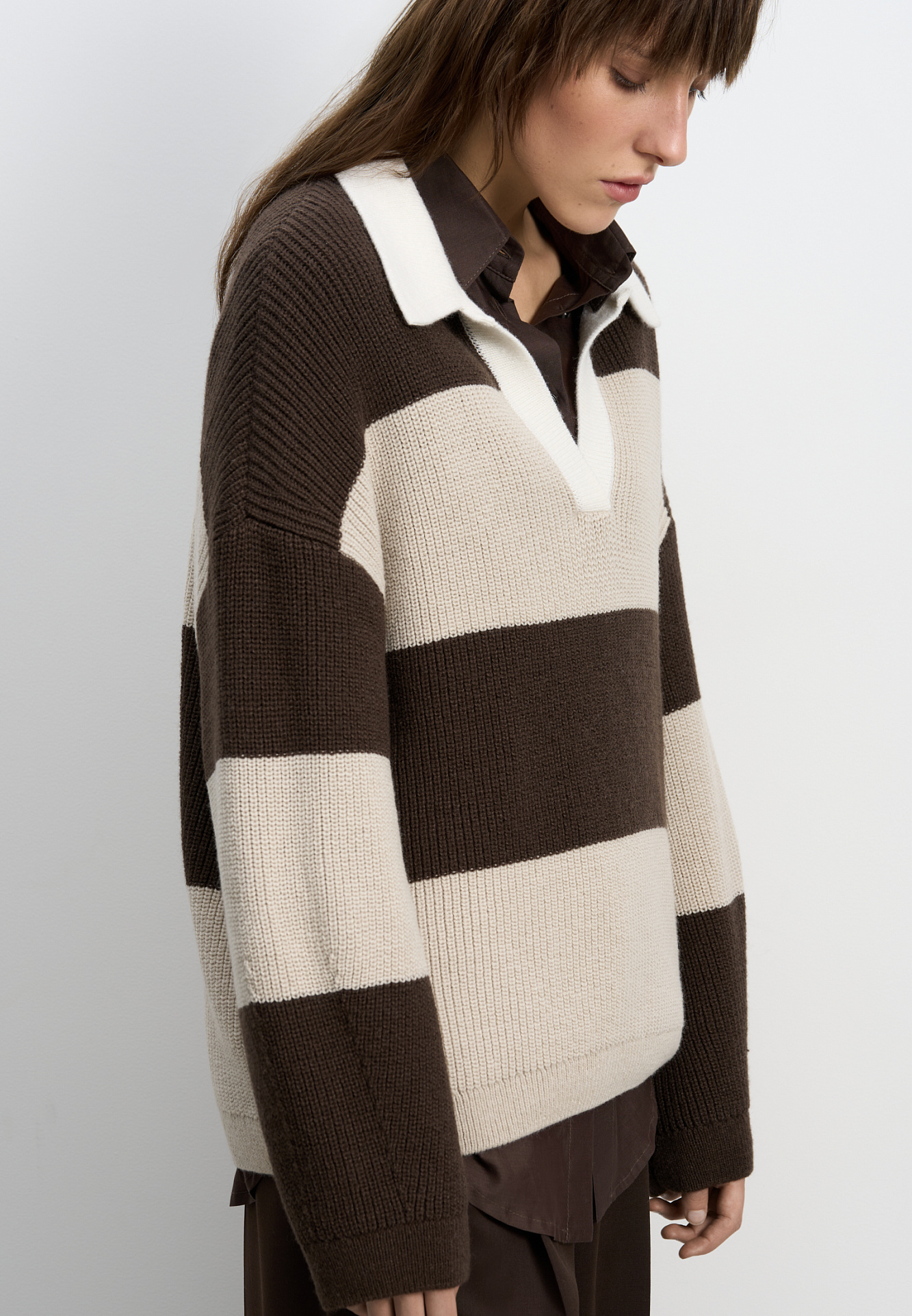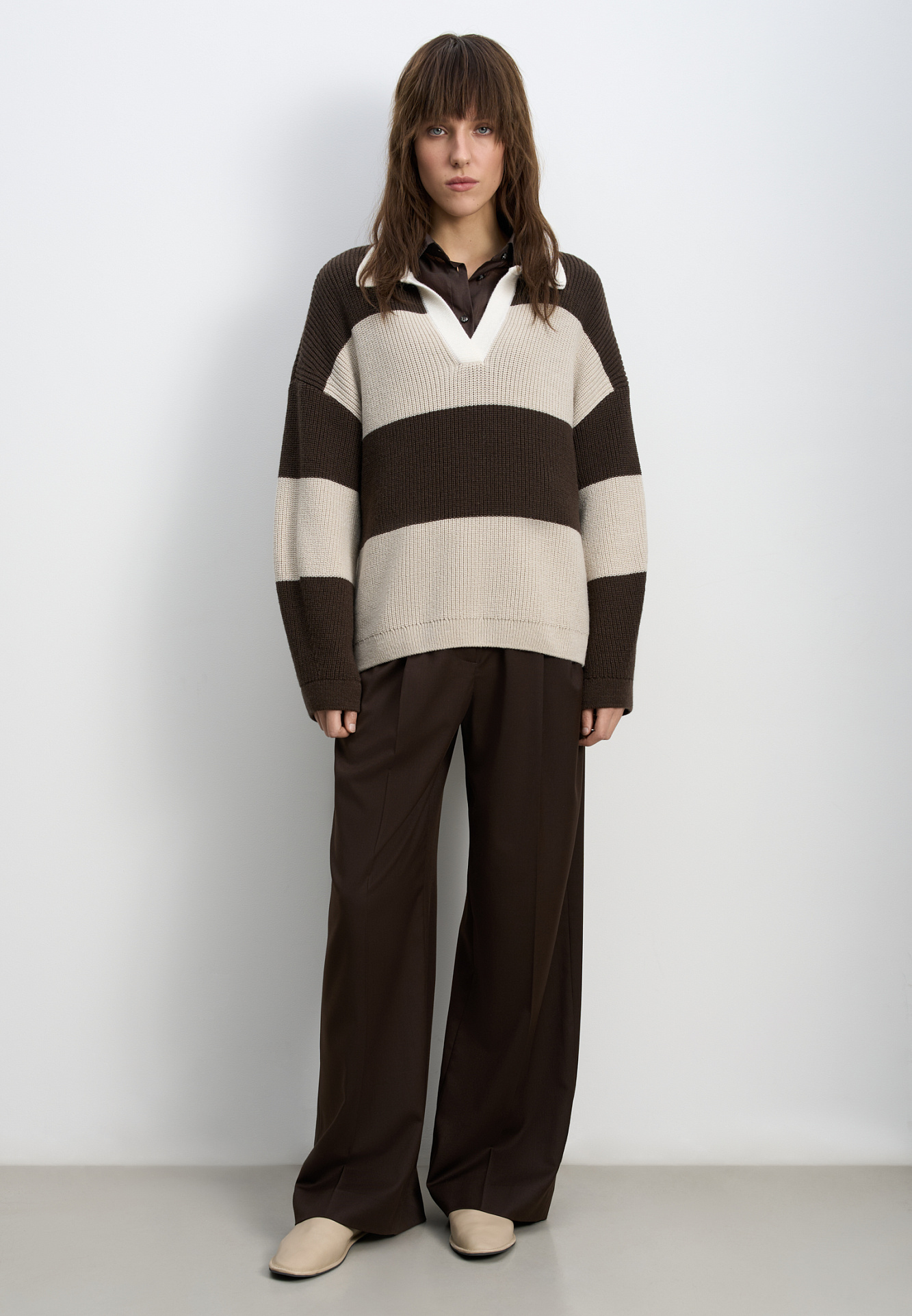 Трикотажный джемпер из шерсти в полоску. Модель свободного силуэта, со спущенной линией плеч, длинными рукавами, отложным воротничком контрастного цвета и V-образным вырезом горловины.
