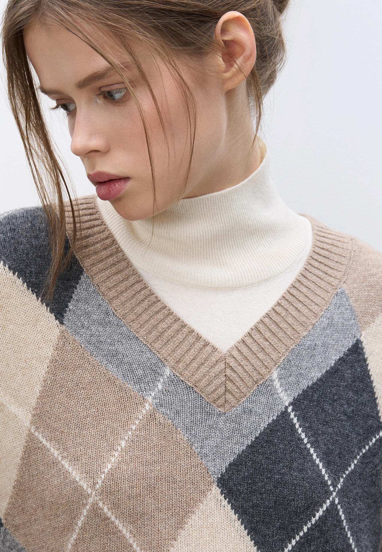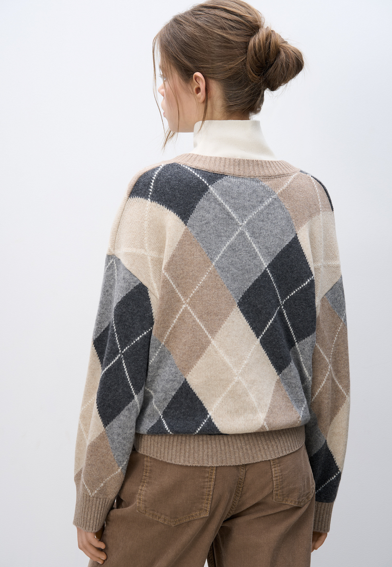 Трикотажный джемпер из кашемира с узором аргайл. Модель свободного силуэта, со спущенной линией плеча и V-вырезом горловины. Края изделия выполнены в рубчик.