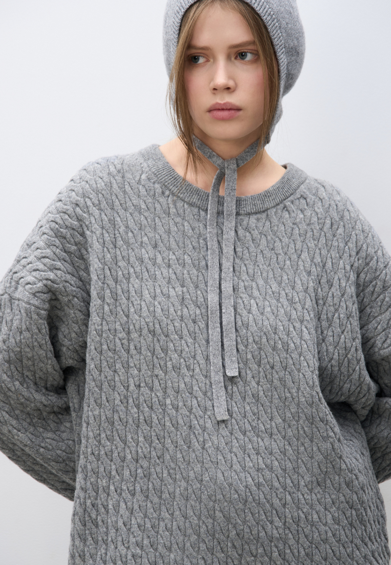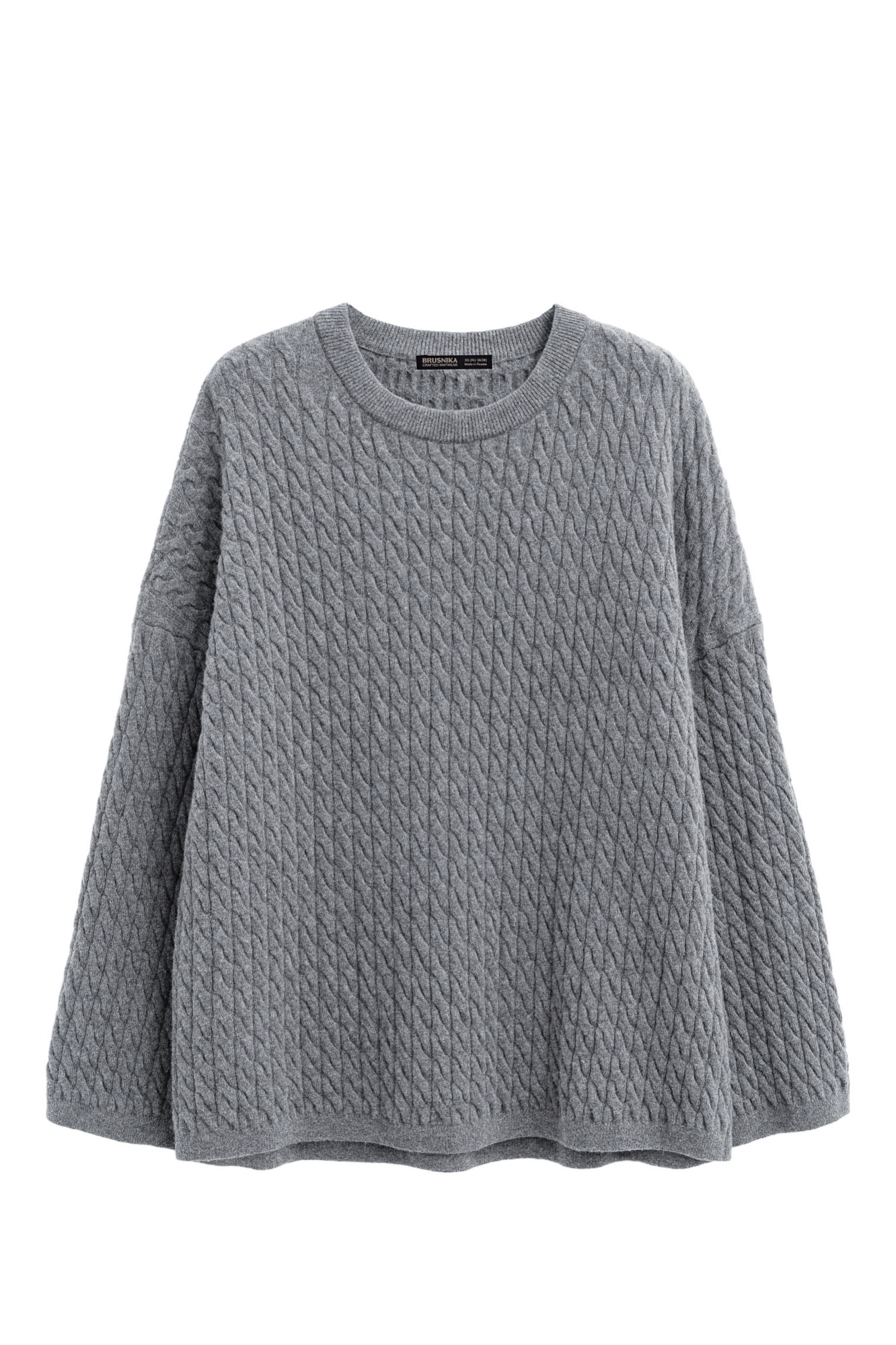 Трикотажный джемпер с объемными косами из 100% шерсти мериноса экстрафайн. Модель свободного силуэта, со спущенной линией плеч и круглым вырезом горловины, оформленным двойной бейкой. Края изделия выполнены в мелкий рубчик.