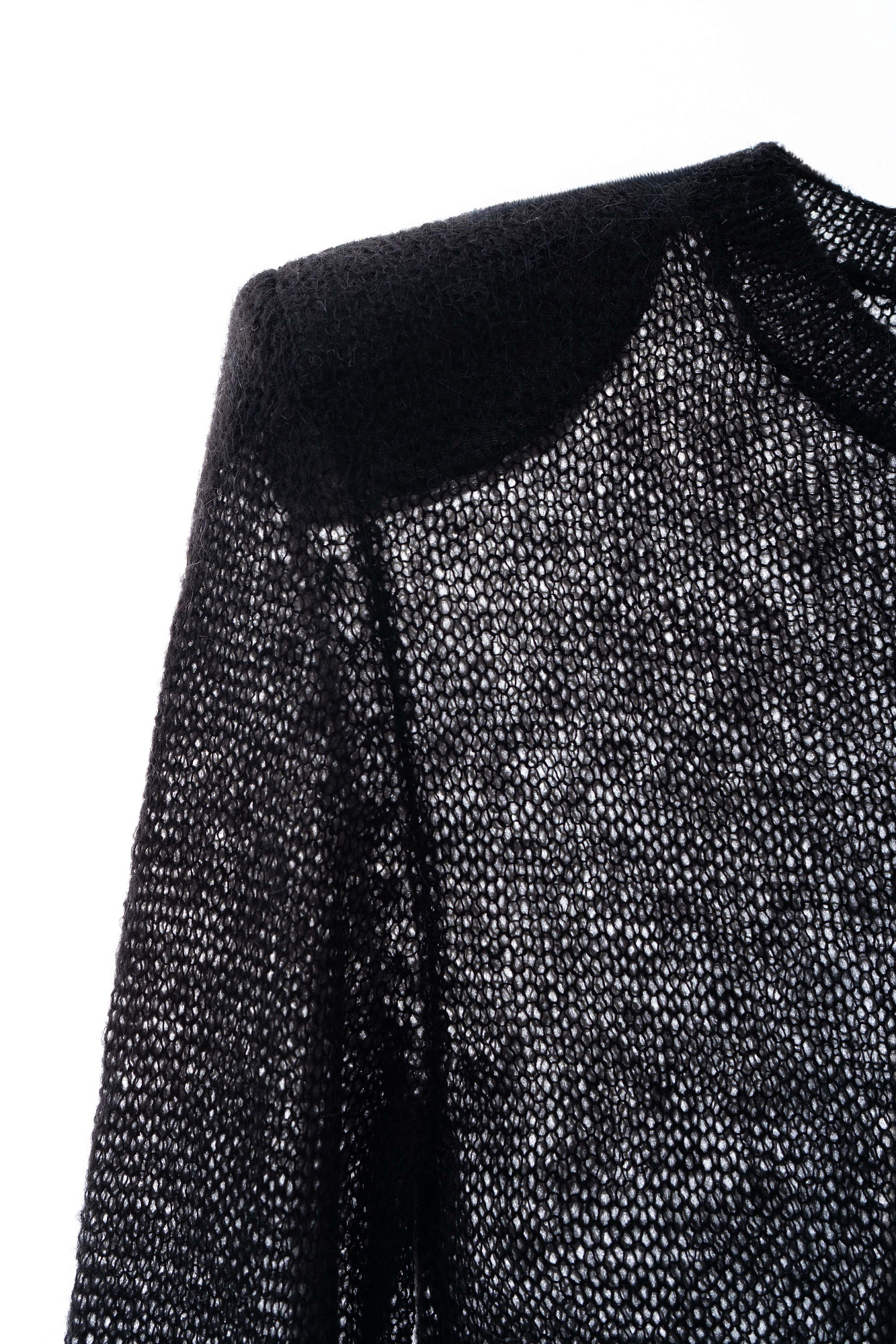 Полупрозрачный трикотажный джемпер из шерсти с добавлением мохера. Модель по фигуре с круглым вырезом горловины. Изделие с подплечниками.