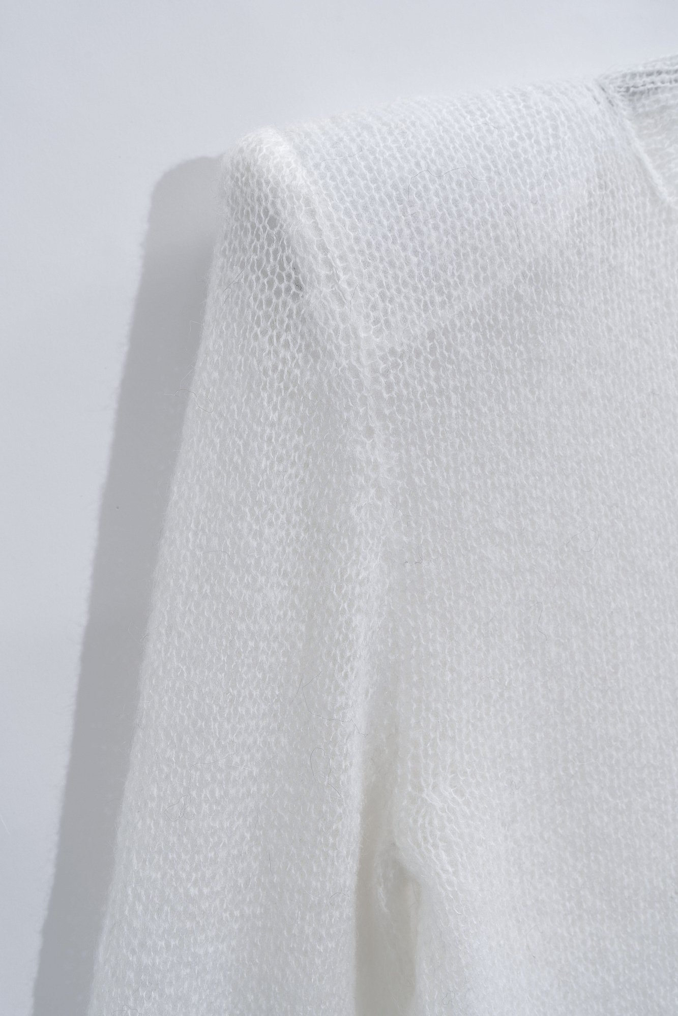 Полупрозрачный трикотажный джемпер из шерсти с добавлением мохера. Модель по фигуре с круглым вырезом горловины. Изделие с подплечниками.