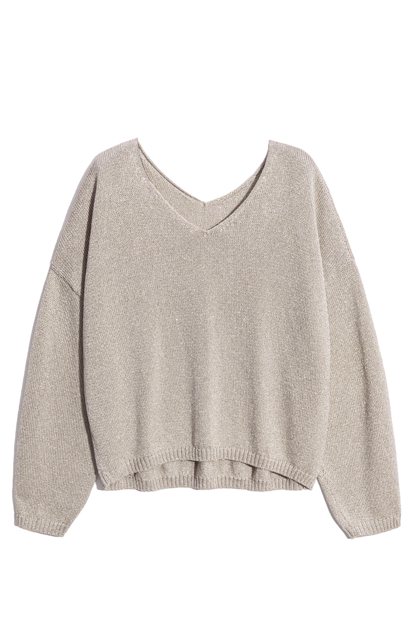 Джемпер из вискозы с добавлением люрекса. Модель свободного силуэта, со спущенной линией плеч и V-образным вырезом. Манжеты рукавов и низ изделия выполнены в рубчик.