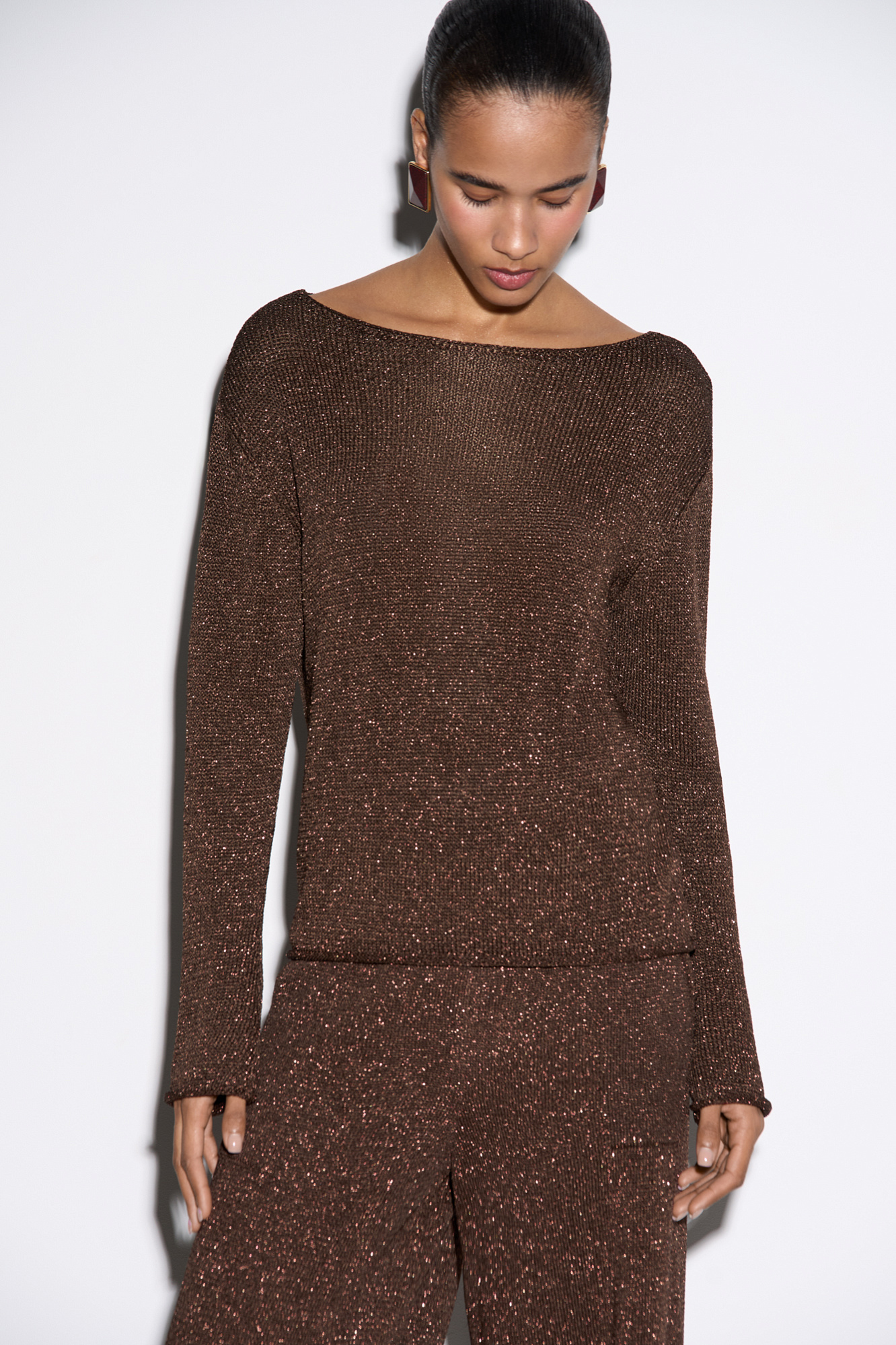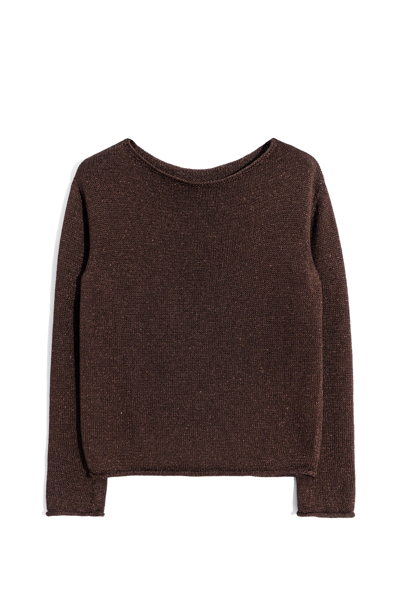 Лонгслив из вискозы с люрексом. Модель с вырезом-лодочкой и длинными рукавами. Манжеты рукавов и низ изделия декорированы валиками.