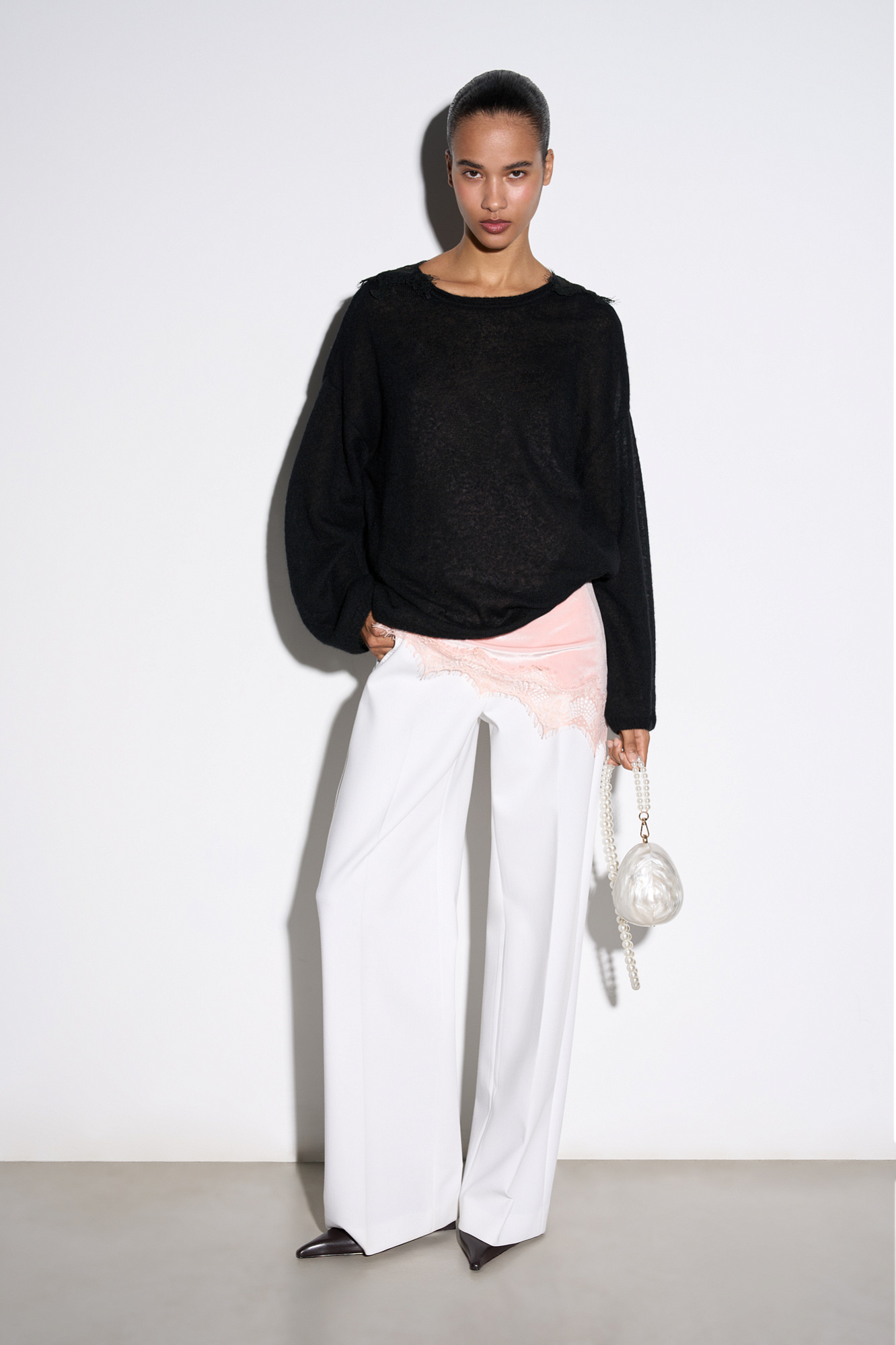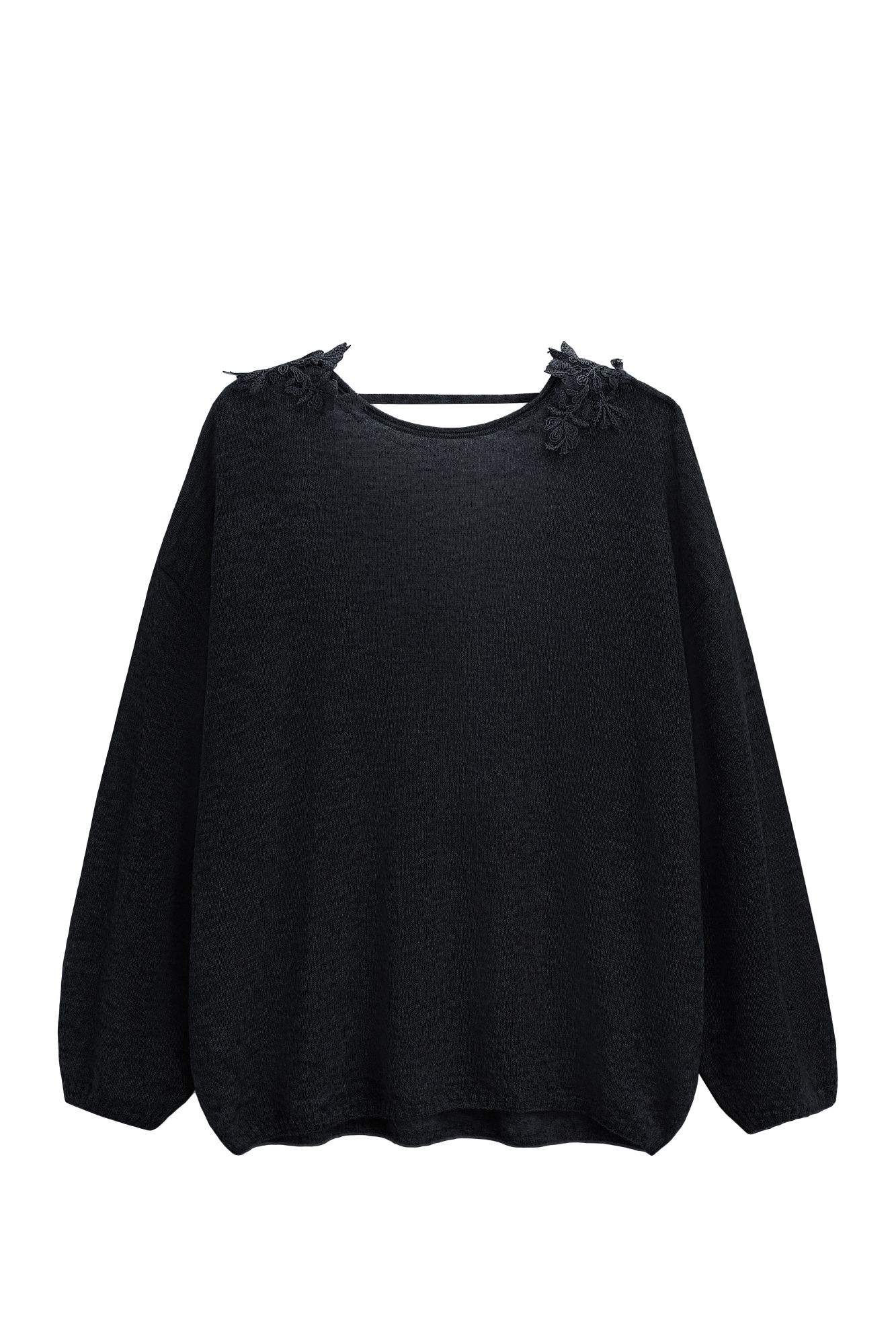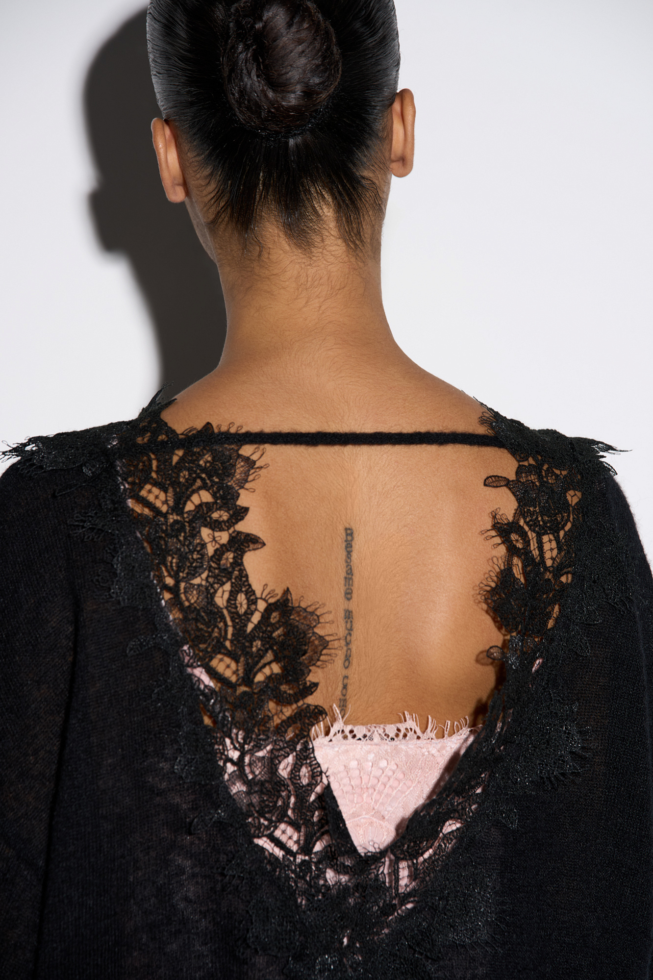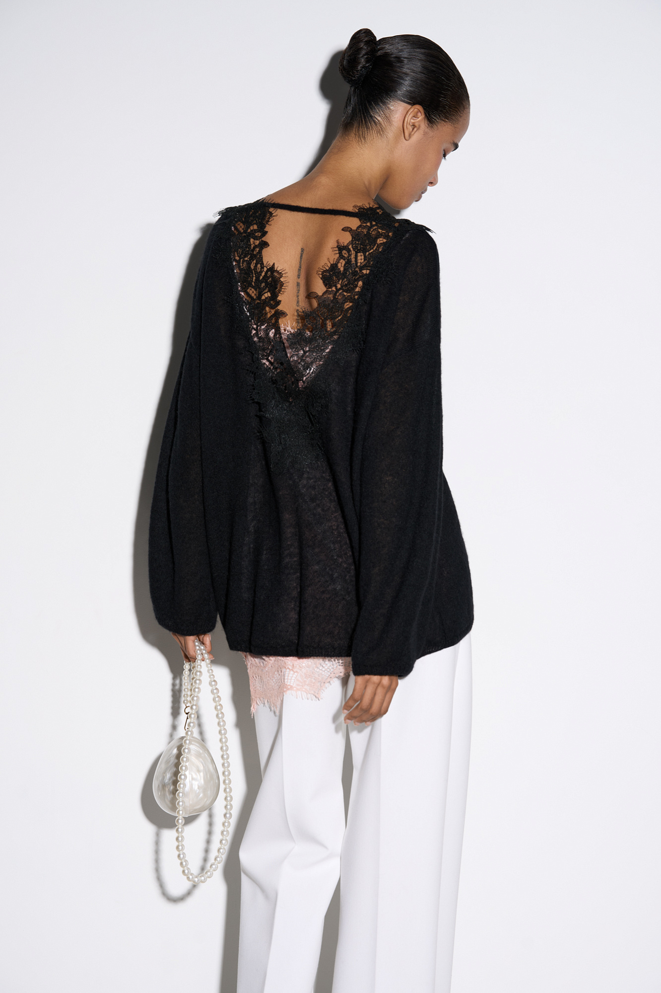 Трикотажный полупрозрачный джемпер из шерсти мериноса экстрафайн и альпака экстрафайн. Модель свободного силуэта со спущенной линией плеча и V-образным вырезом на спинке, декорированным кружевом.