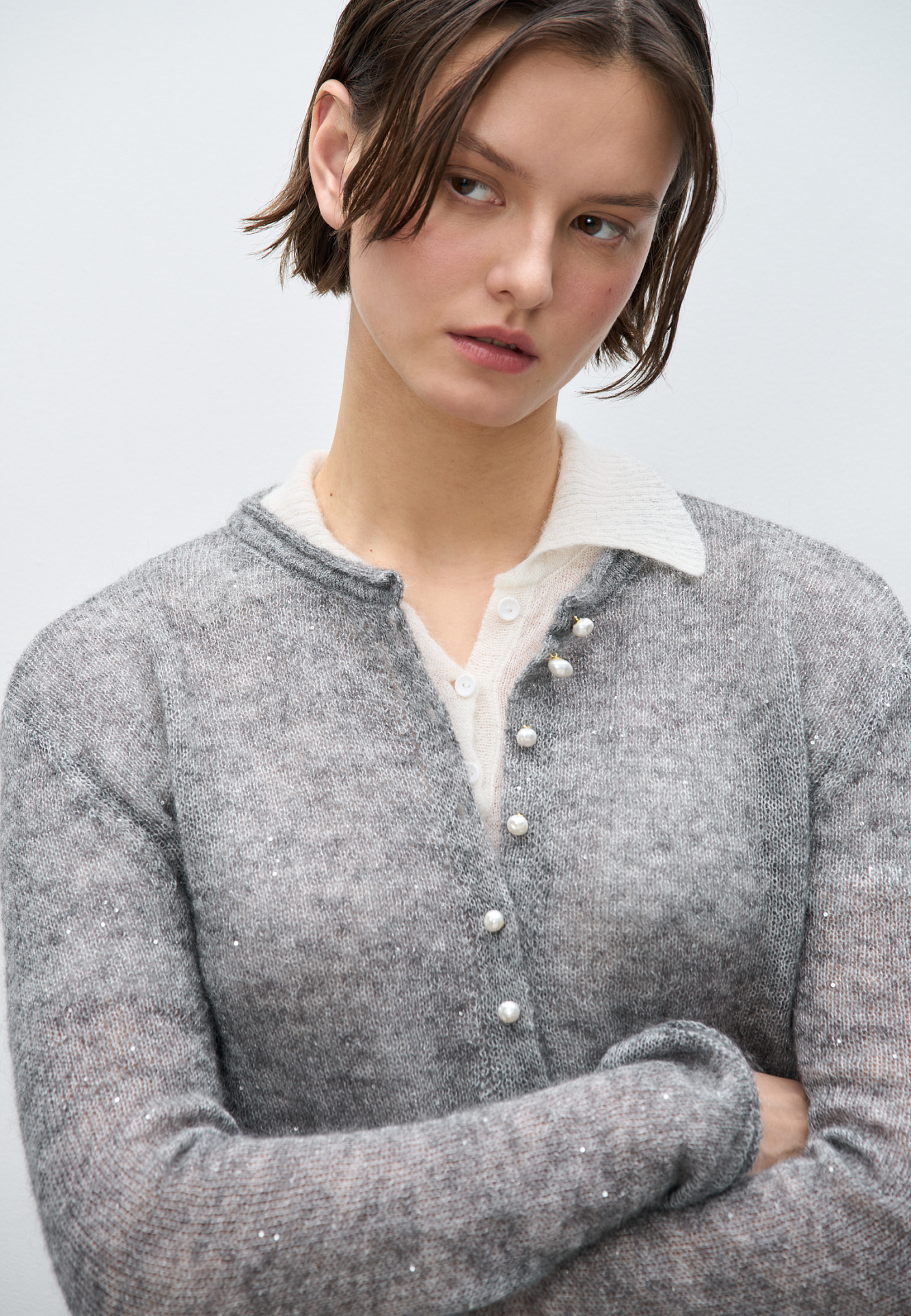 Трикотажный лонгслив из кидмохера, декорированный мелкими пайетками. Модель с круглым вырезом горловины с планкой на пуговицах. Края изделия декорированы валиком.