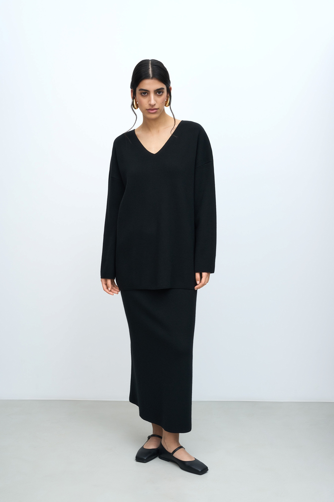 Удлиненный трикотажный джемпер из шерсти с добавлением кашемира. Модель свободного силуэта со спущенной линией плеча и глубоким V-образным вырезом. Дополнить образ можно комплектной юбкой.