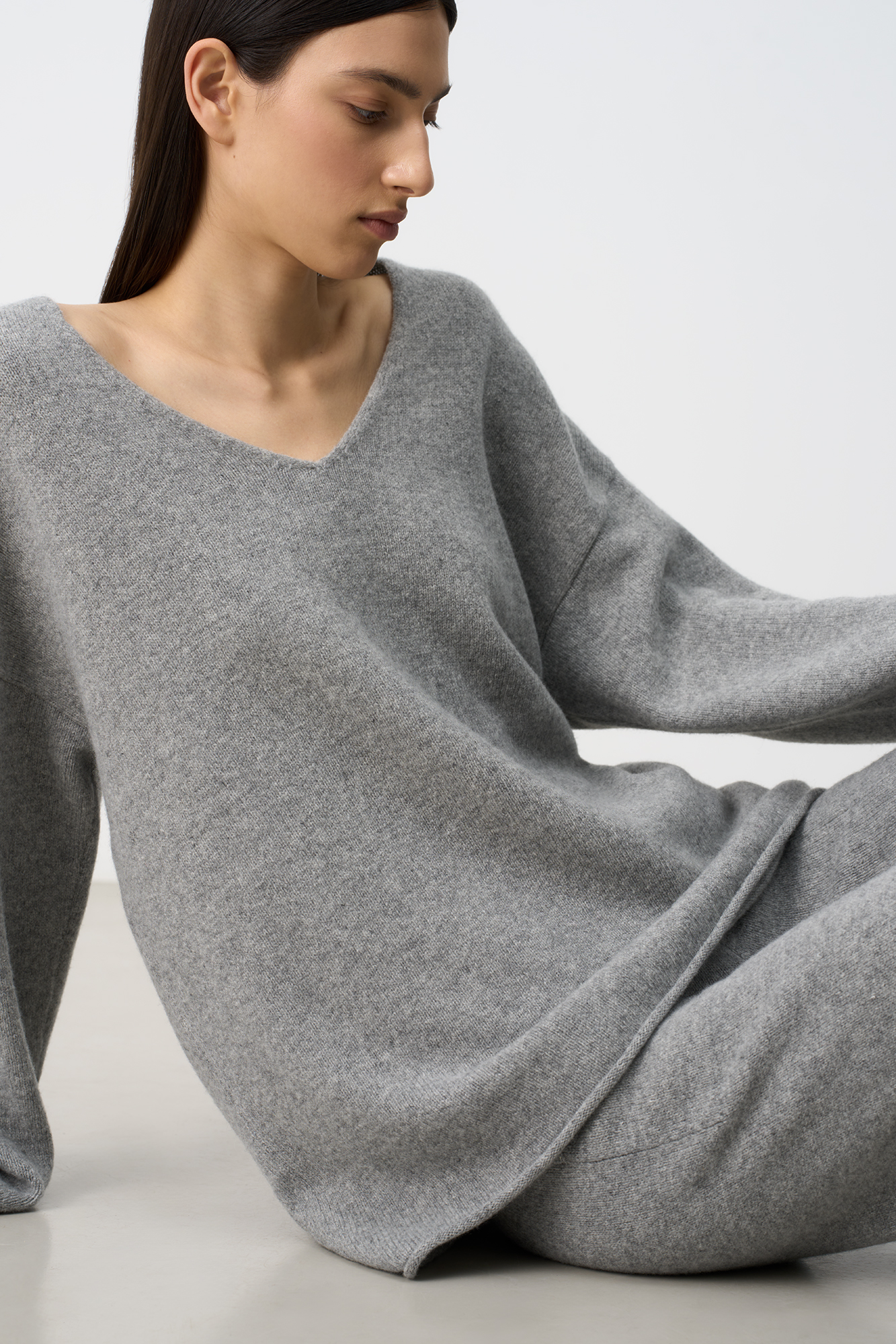 Трикотажный джемпер с V-образным вырезом из 100% кашемира. Модель свободного силуэта со спущенной линией плеча. Дополнить образ можно брюками в таком же стиле.