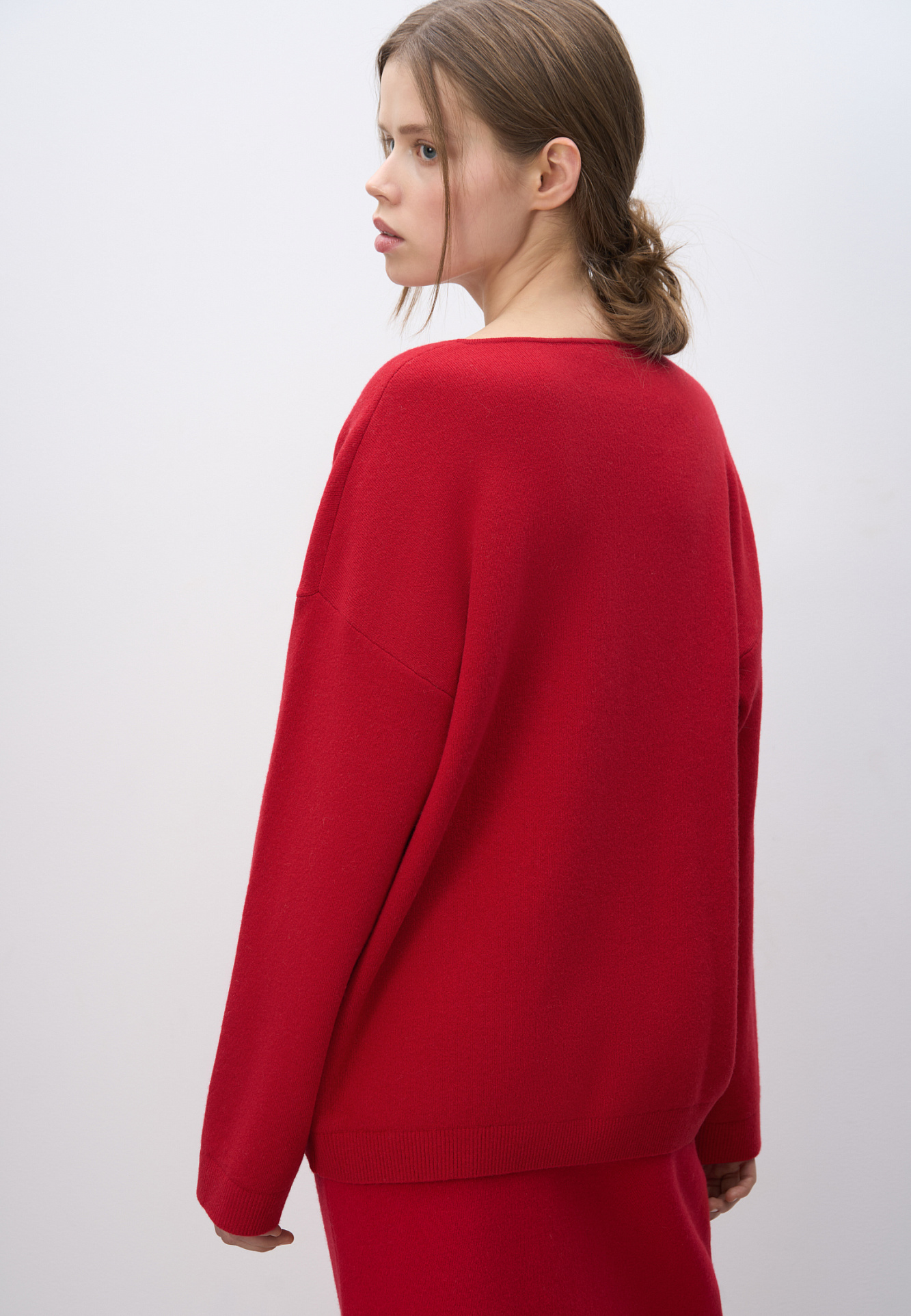 Трикотажный джемпер из шерсти с добавлением кашемира. Модель свободного силуэта со спущенной линией плеч и V-образным вырезом горловины. Манжеты рукавов и низ изделия выполнены в рубчик.