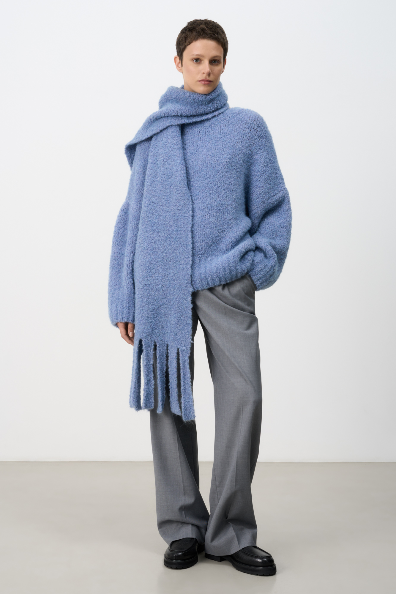 Трикотажный джемпер из шерсти альпака. Модель свободного силуэта со спущенной линией плеча. Края изделия в рубчик. В комплекте широкий шарф с брендированным ярлыком.