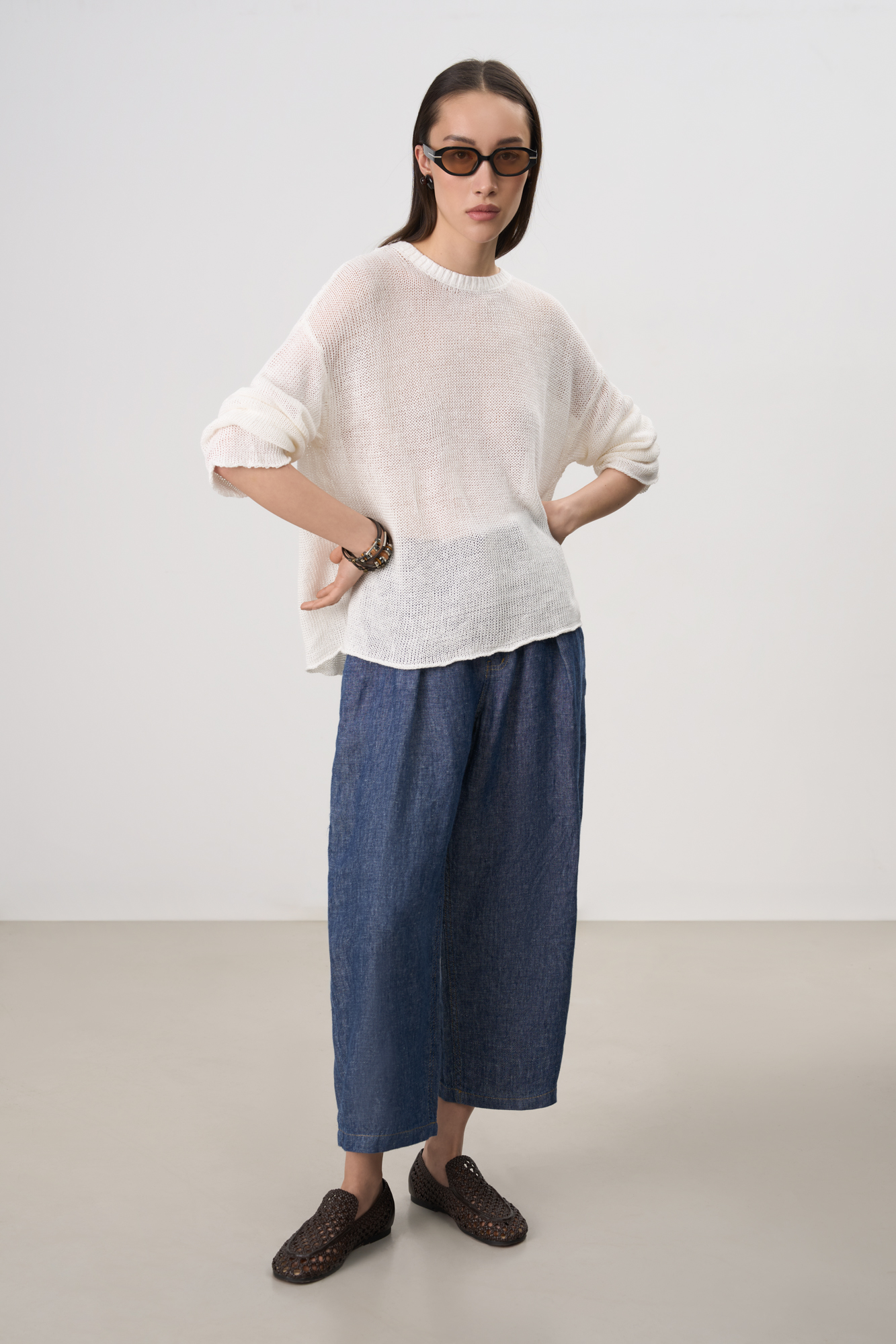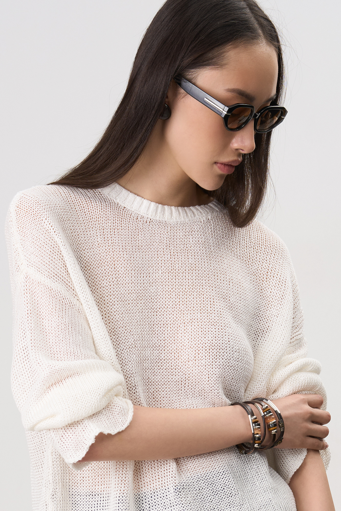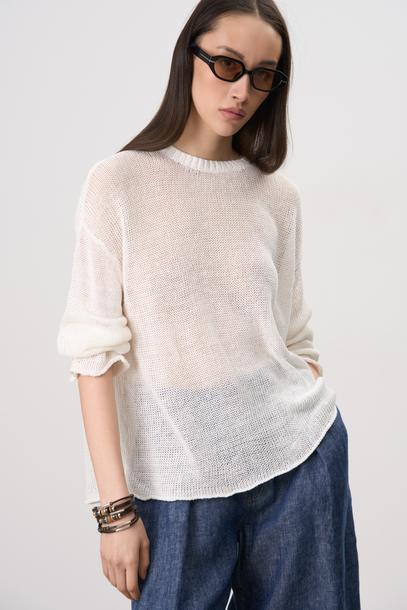 Джемпер из 100% льна крупной вязки. Модель свободного силуэта со спущенной линией плеча и круглым вырезом горловины.