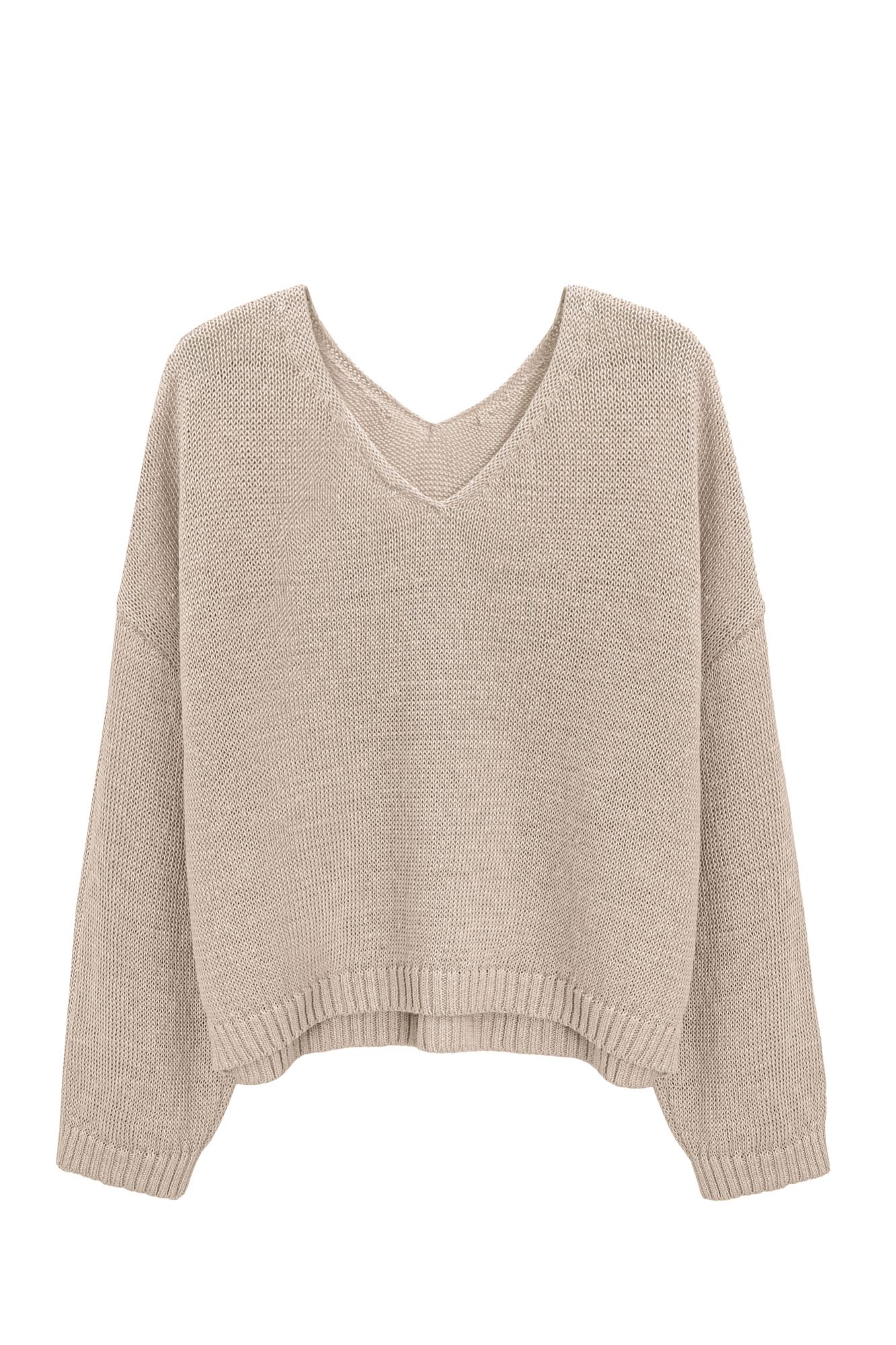 Трикотажный джемпер из 100% льна с V-образным вырезом. Модель прямого силуэта с длинным рукавом и удлиненной спинкой. Края изделия выполнены в рубчик.