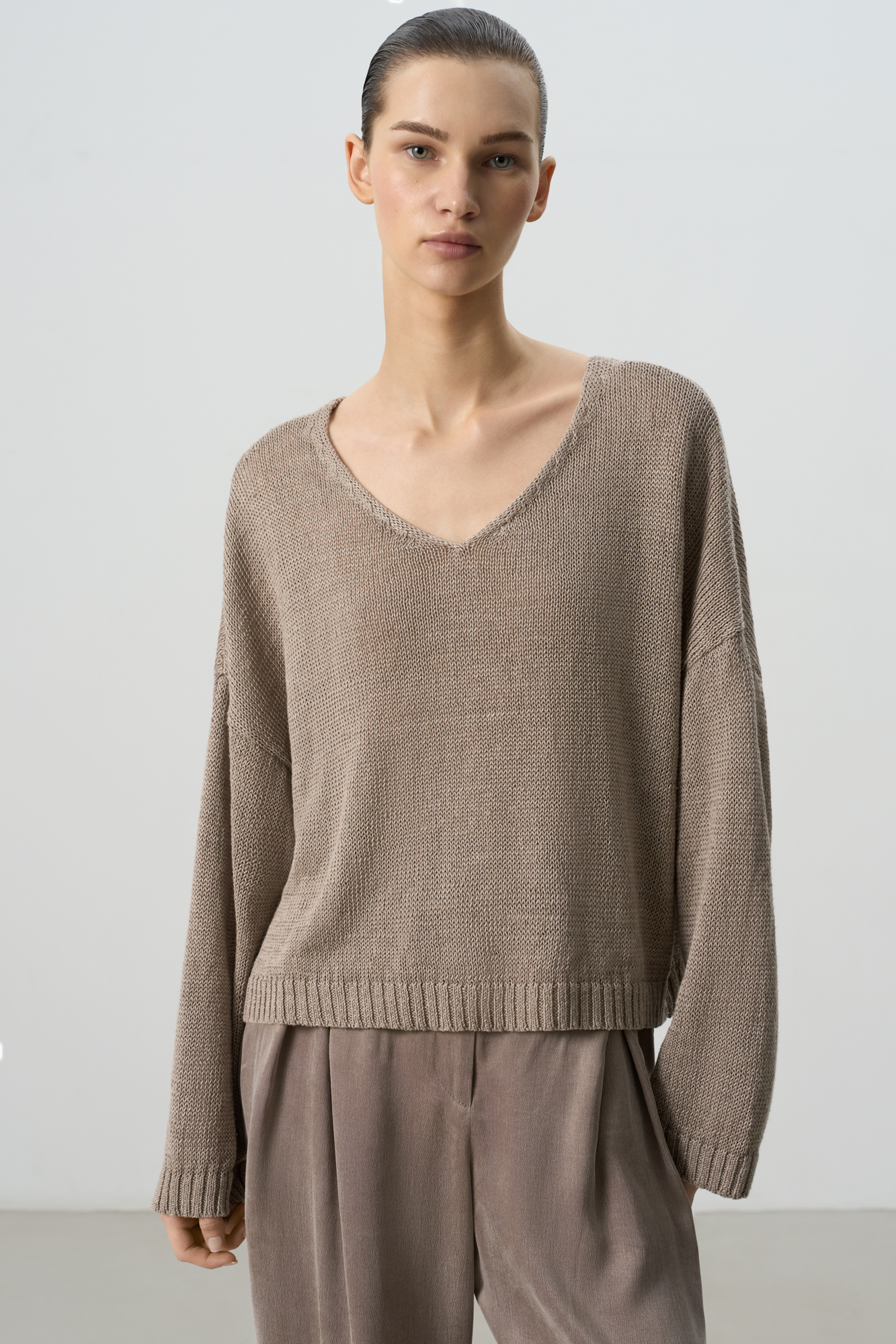 Трикотажный джемпер из 100% льна с V-образным вырезом. Модель прямого силуэта с длинным рукавом и удлиненной спинкой. Края изделия выполнены в рубчик.