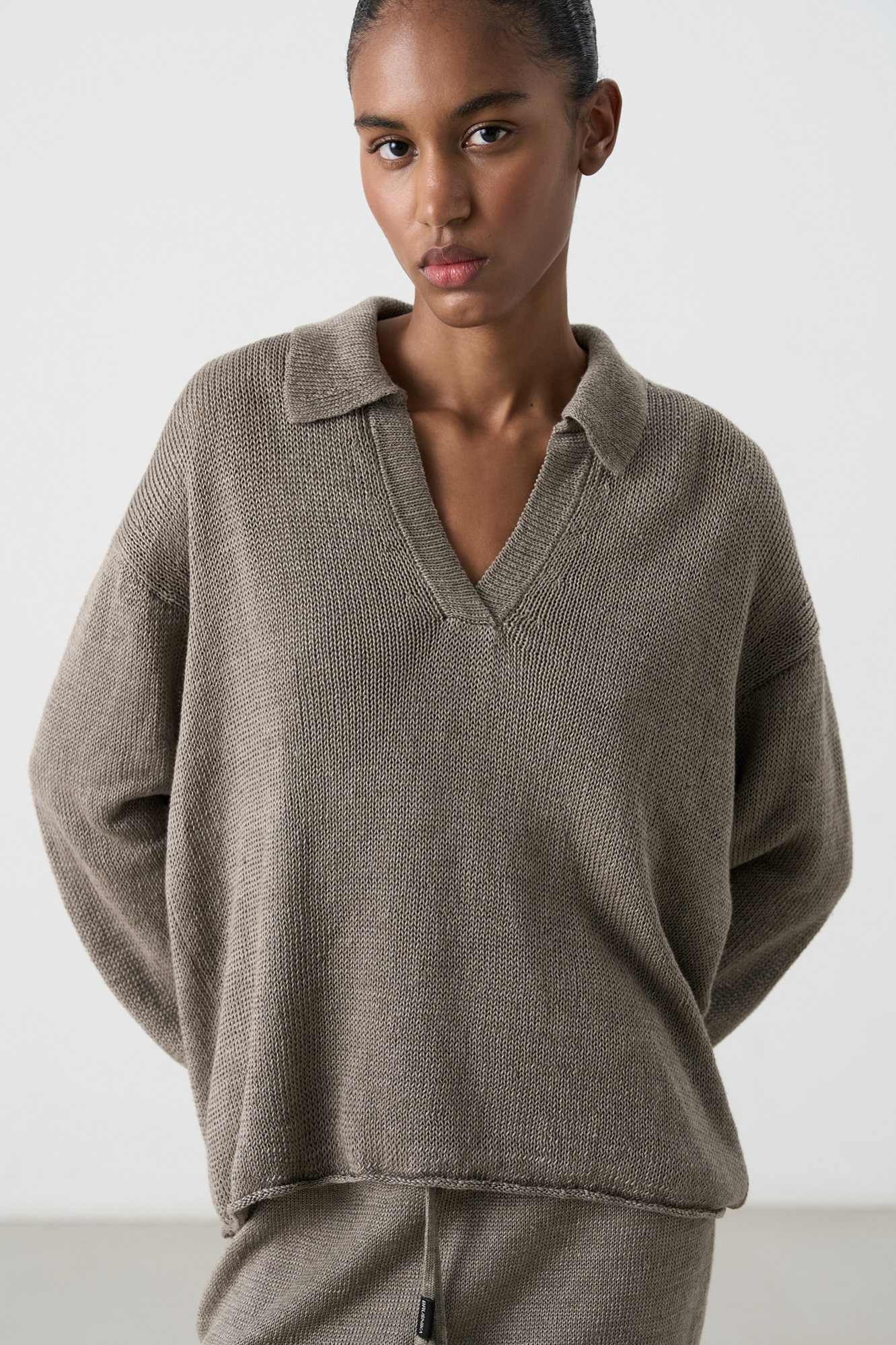 Трикотажный джемпер из 100% льна с воротником поло. Модель свободного силуэта, со спущенной линией плеча, длинными рукавами, V-образным вырезом горловины и валиками по нижнему краю изделия.