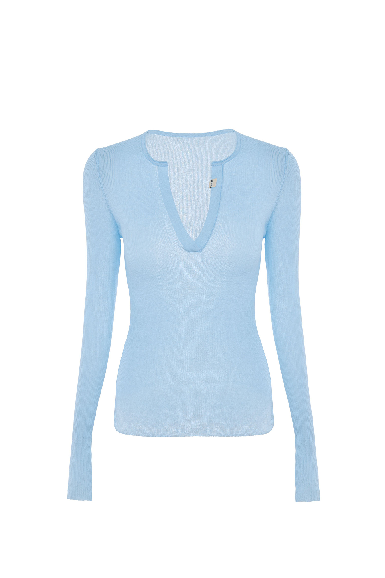 Трикотажный полупрозрачный лонгслив из хлопка с добавлением полиамида. Модель приталенного силуэта с длинными рукавами, V-образным вырезом и брендированным ярлыком на планке.