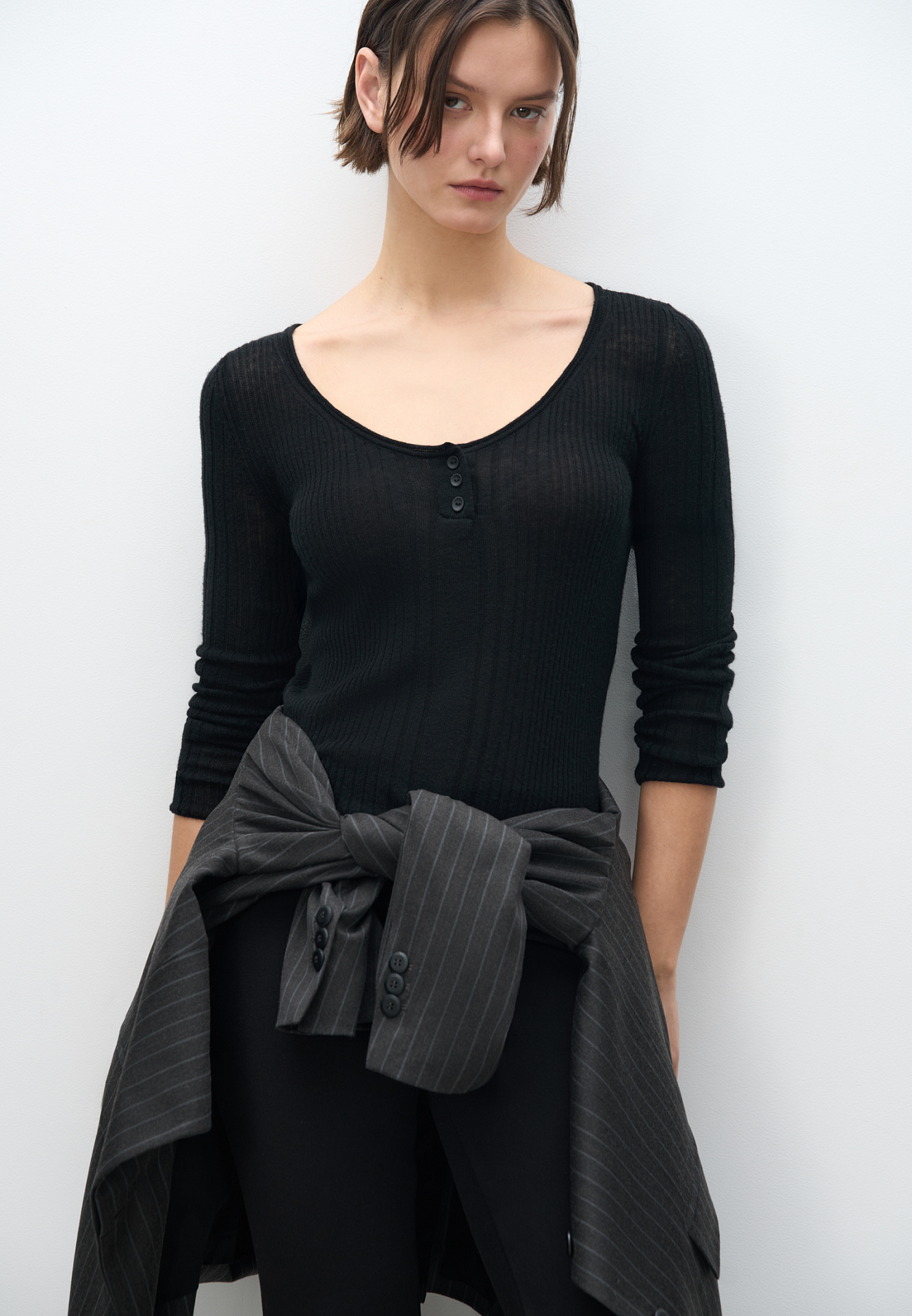Трикотажный лонгслив из шерсти мериноса экстрафайн. Модель с глубоким вырезом горловины с пуговицами.