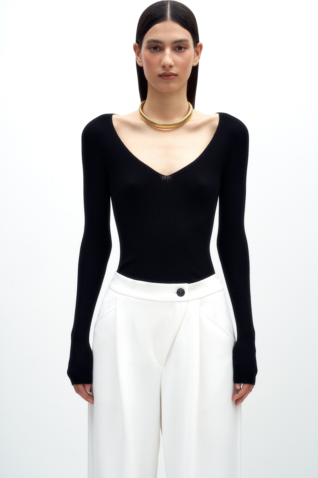Трикотажный лонгслив из вискозы. Модель приталенного силуэта с глубоким V-образным вырезом. Изделие выполнено в рубчик.
