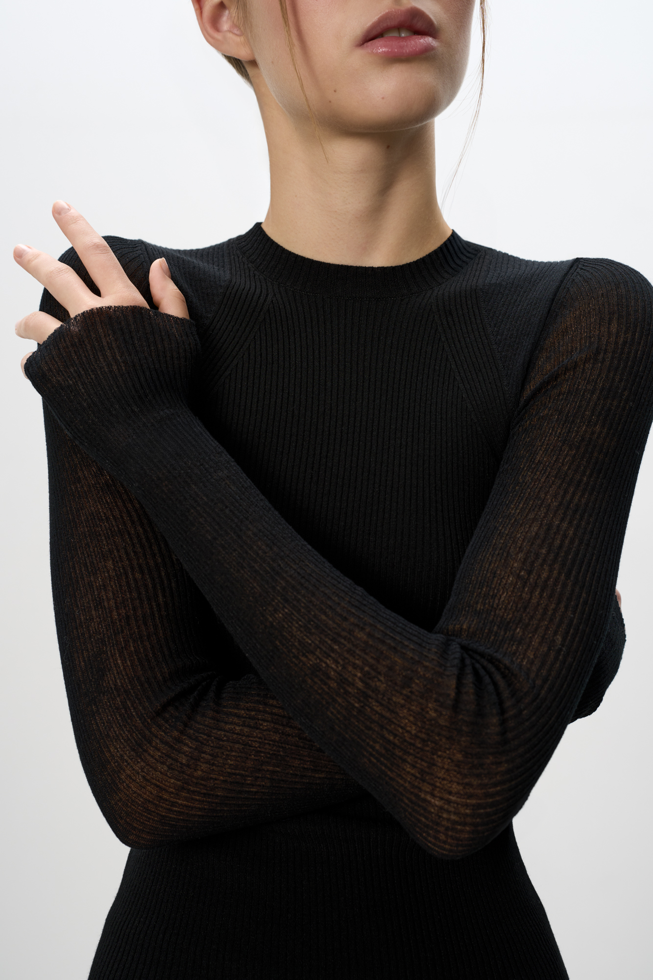 Трикотажный лонгслив из вискозы в рубчик. Модель облегающего силуэта с полупрозрачными длинными рукавами.