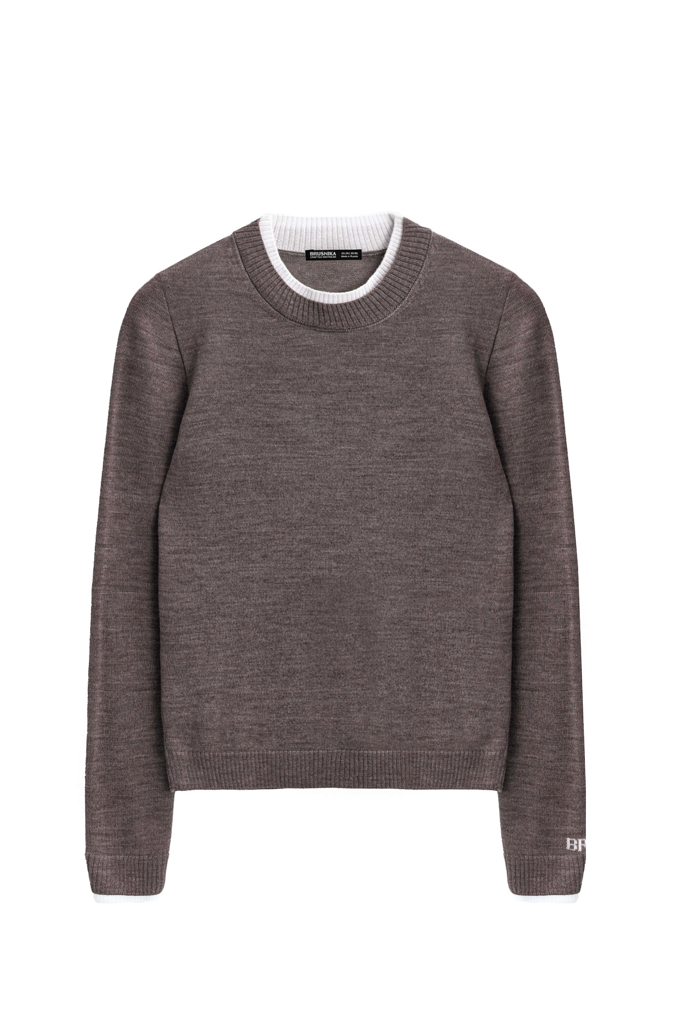 Трикотажный джемпер из шерсти. Модель свободного силуэта с контрастными манжетами и воротничком. Изделие декорировано брендированным жаккардом на рукаве и логотипом на спине.
