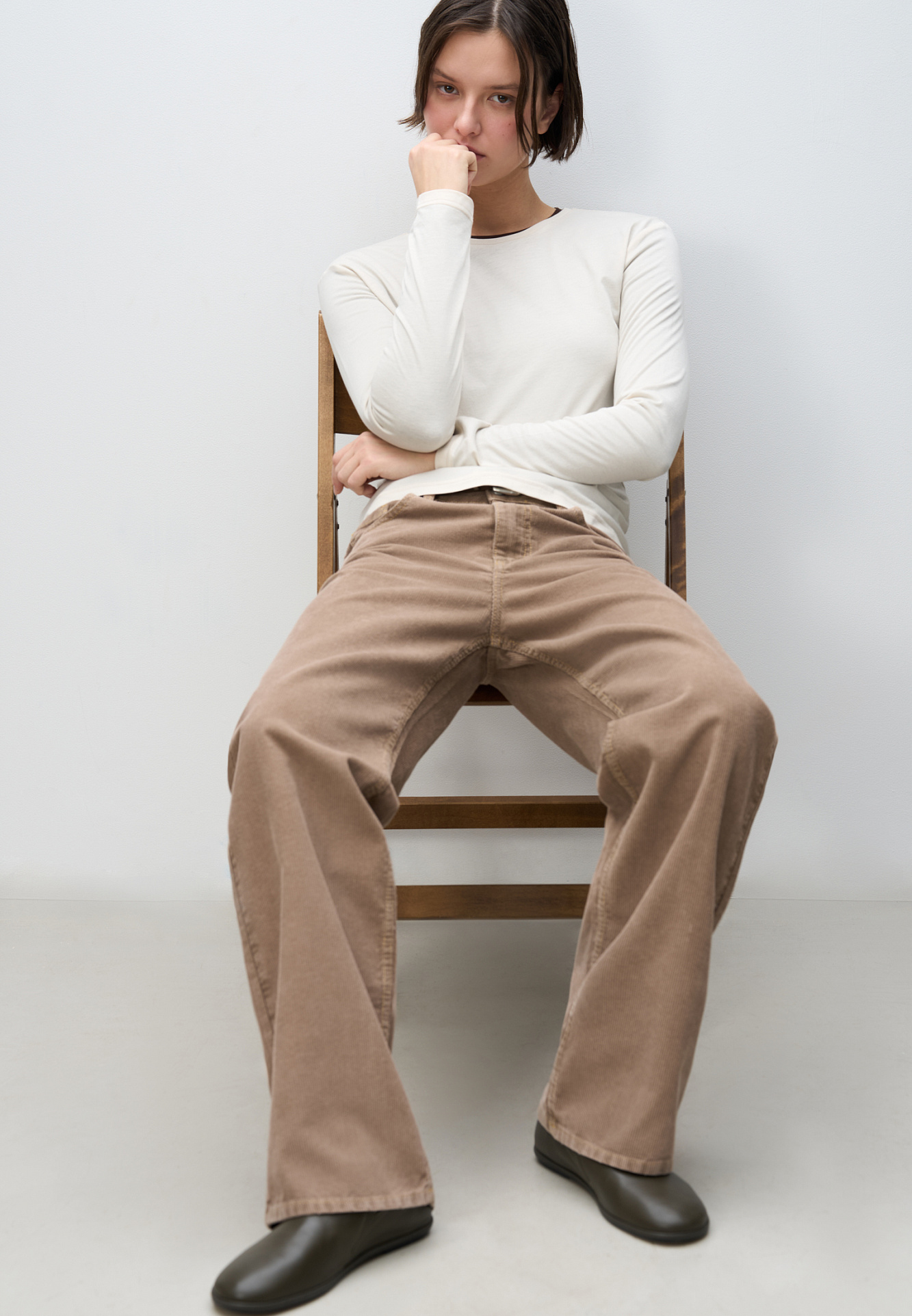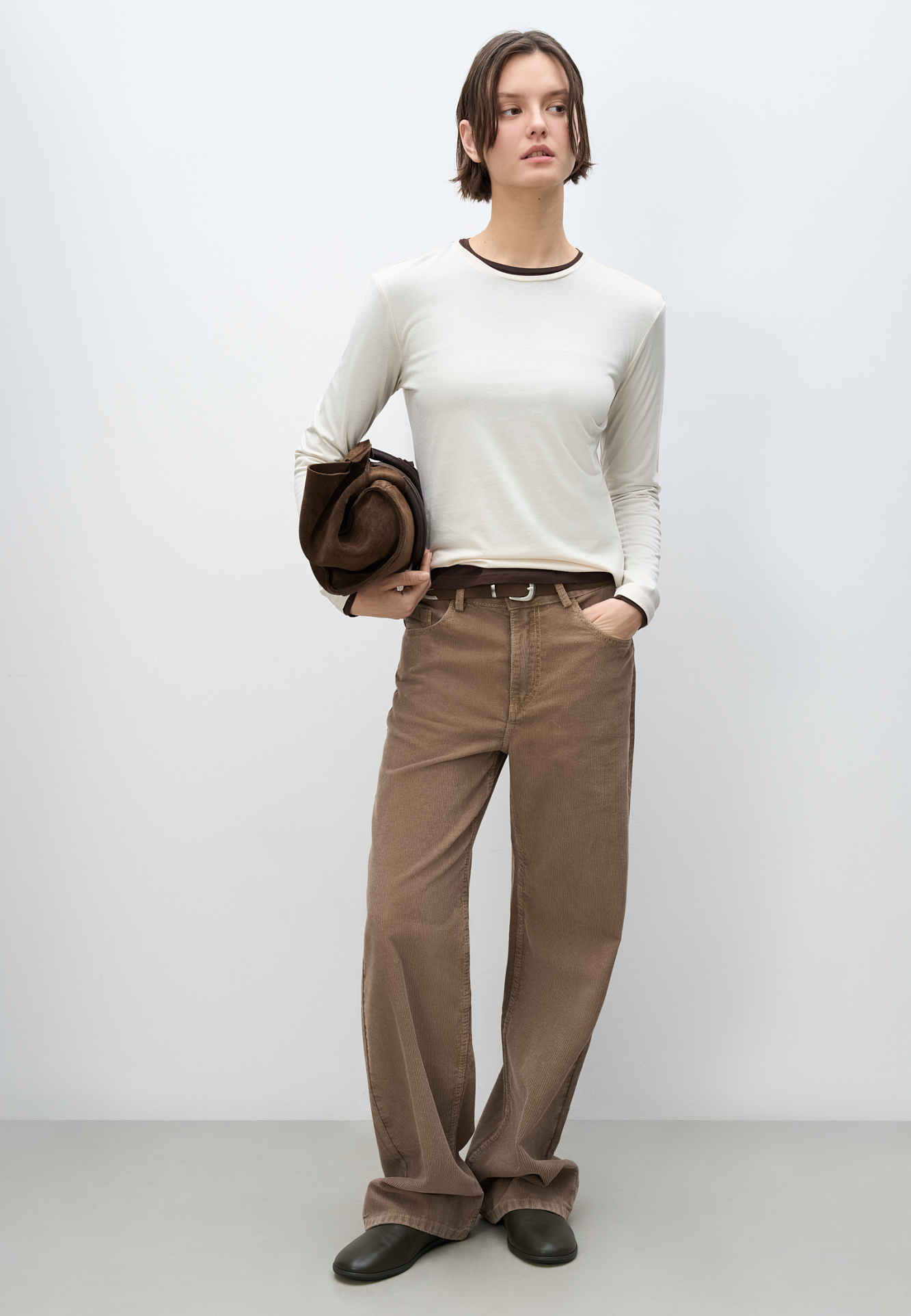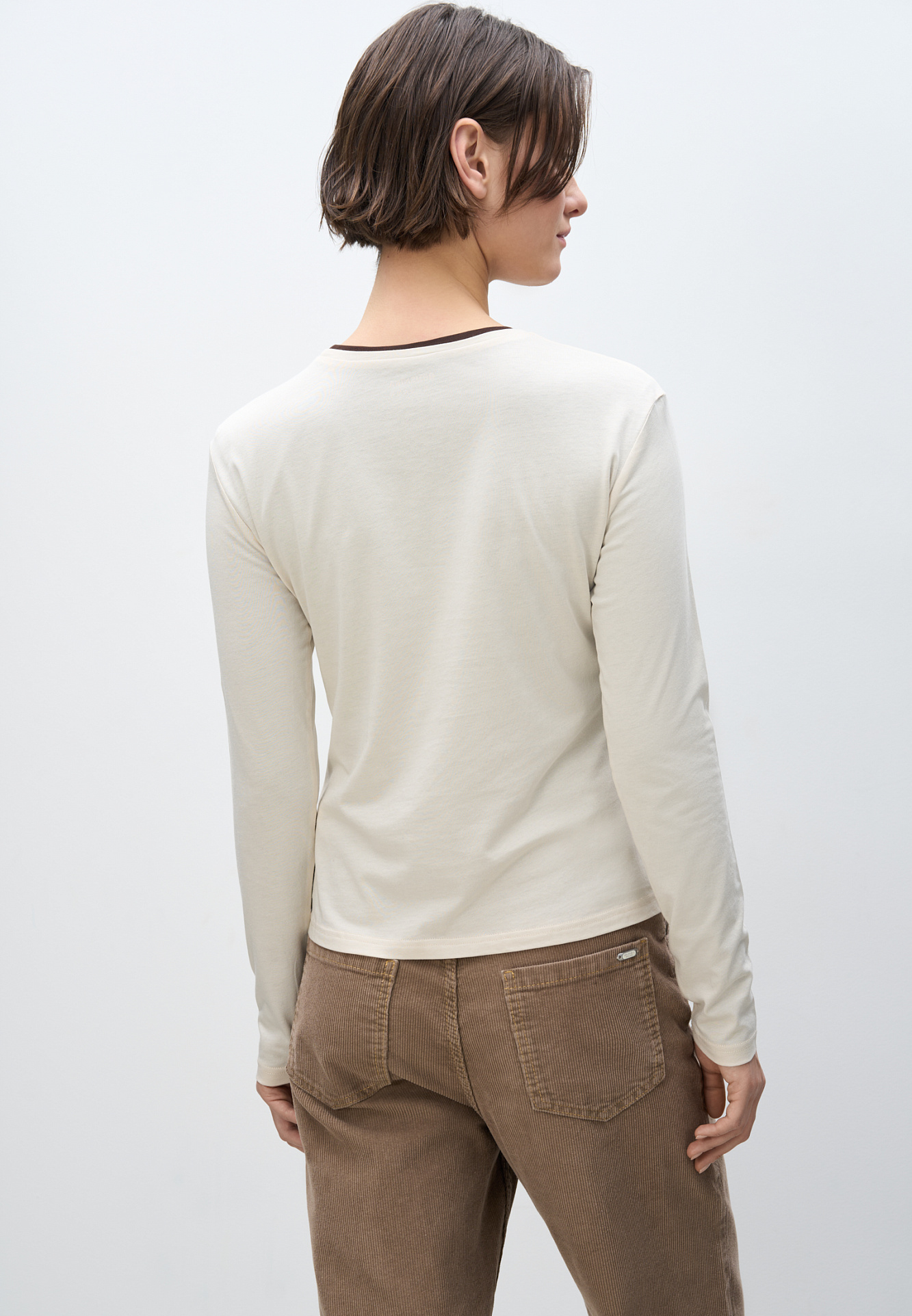 Базовый лонгслив из хлопка с добавлением шерсти. Модель по фигуре с длинными рукавами и круглым вырезом горловины.