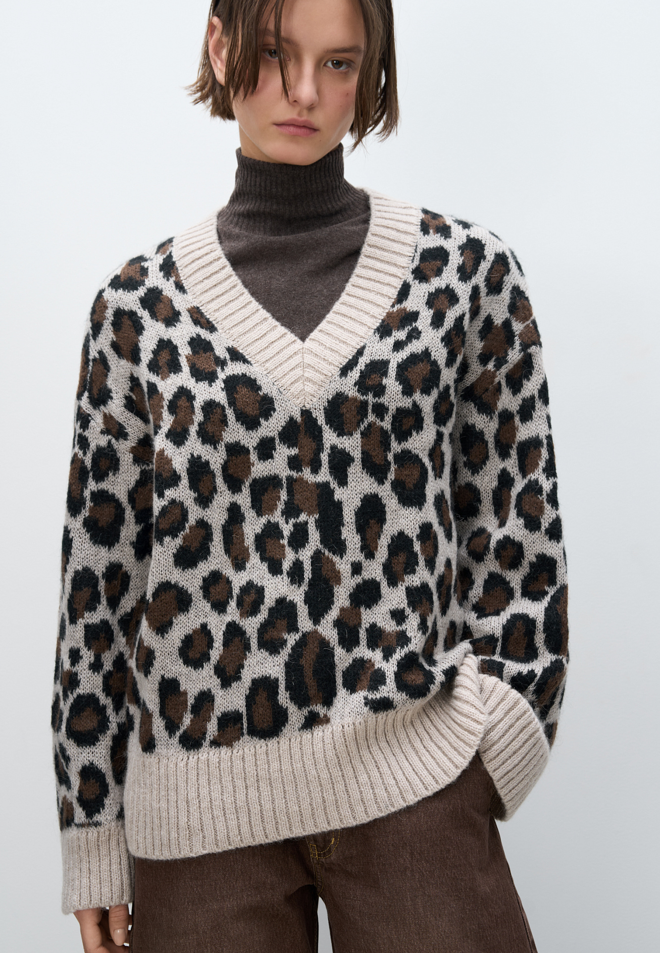Трикотажный джемпер с жаккардовым анималистическим рисунком. Модель свободного силуэта со спущенной линией плеча и V-образным вырезом горловины. Края изделия выполнены в рубчик.