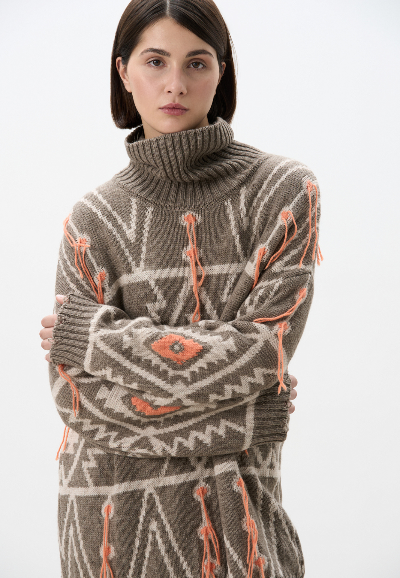 Трикотажный джемпер из шерсти альпака с геометрическим жаккардовым орнаментом. Модель свободного силуэта с высоким воротом и со спущенной линией плеча. Края изделия выполнены в рубчик. Изделие декорировано локаничной бахромой.