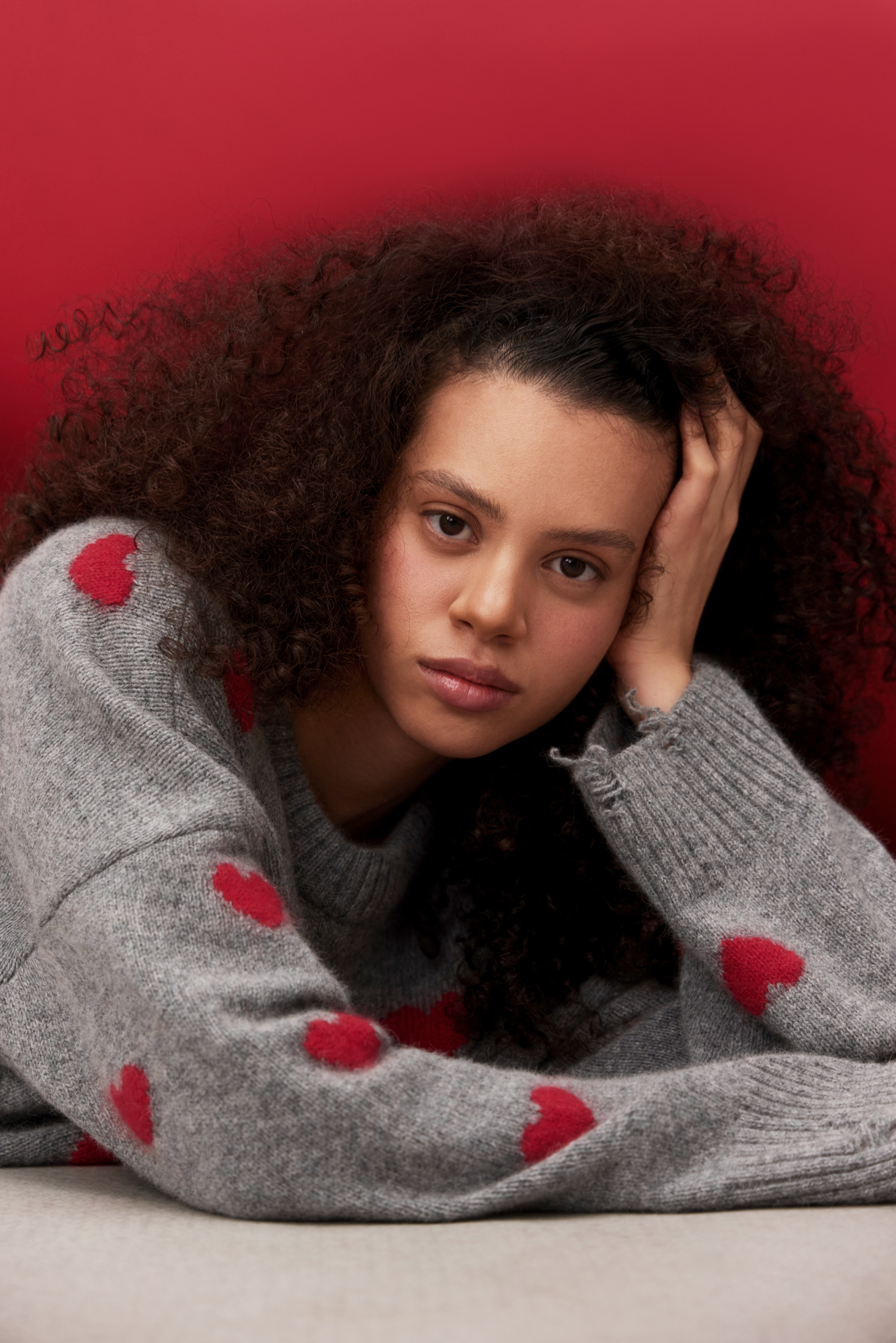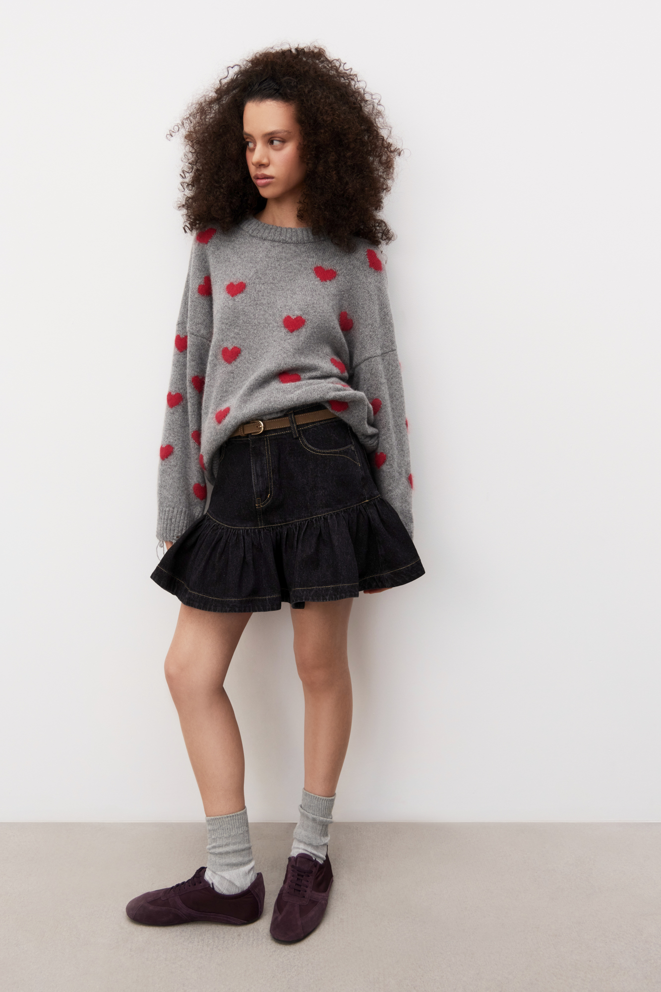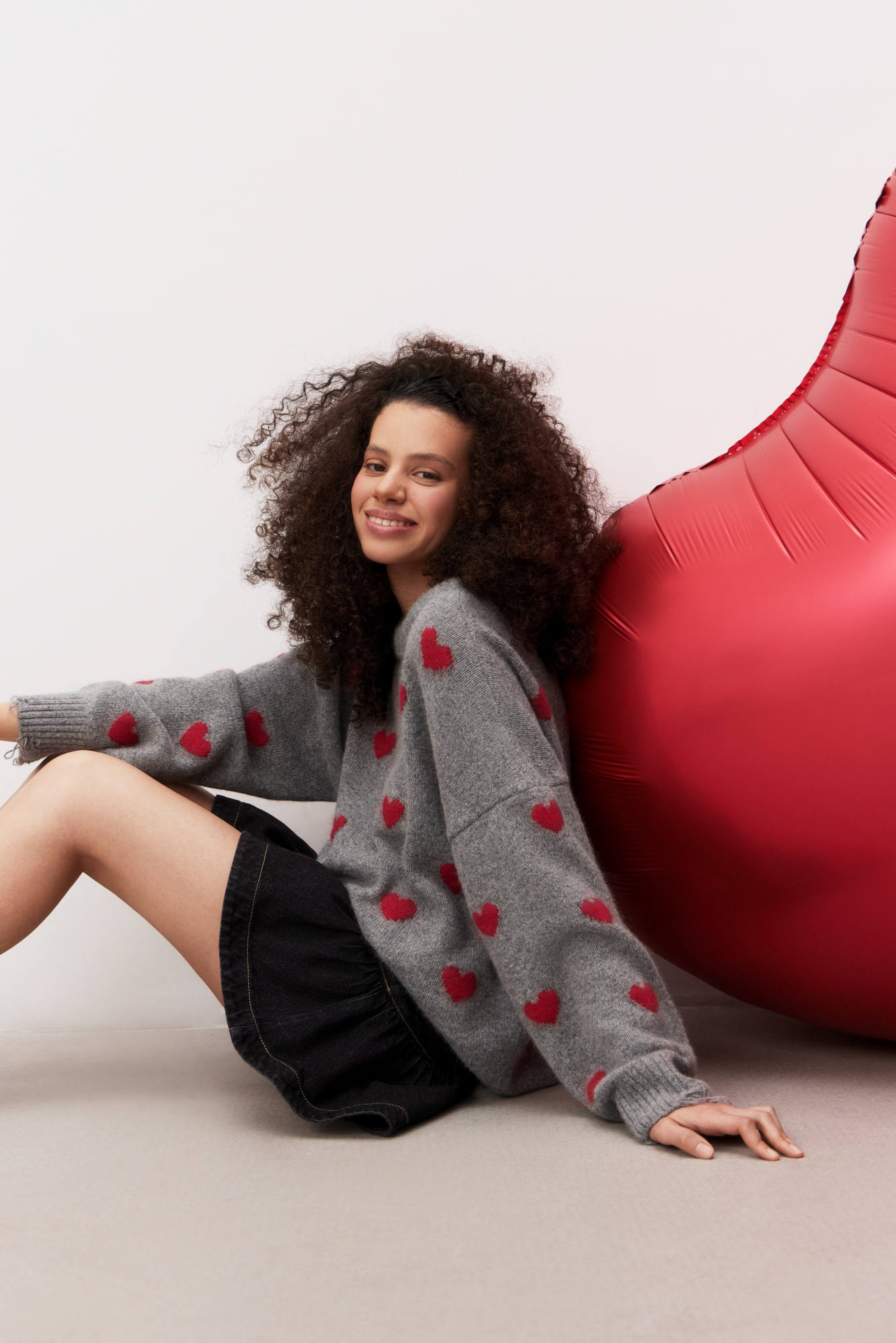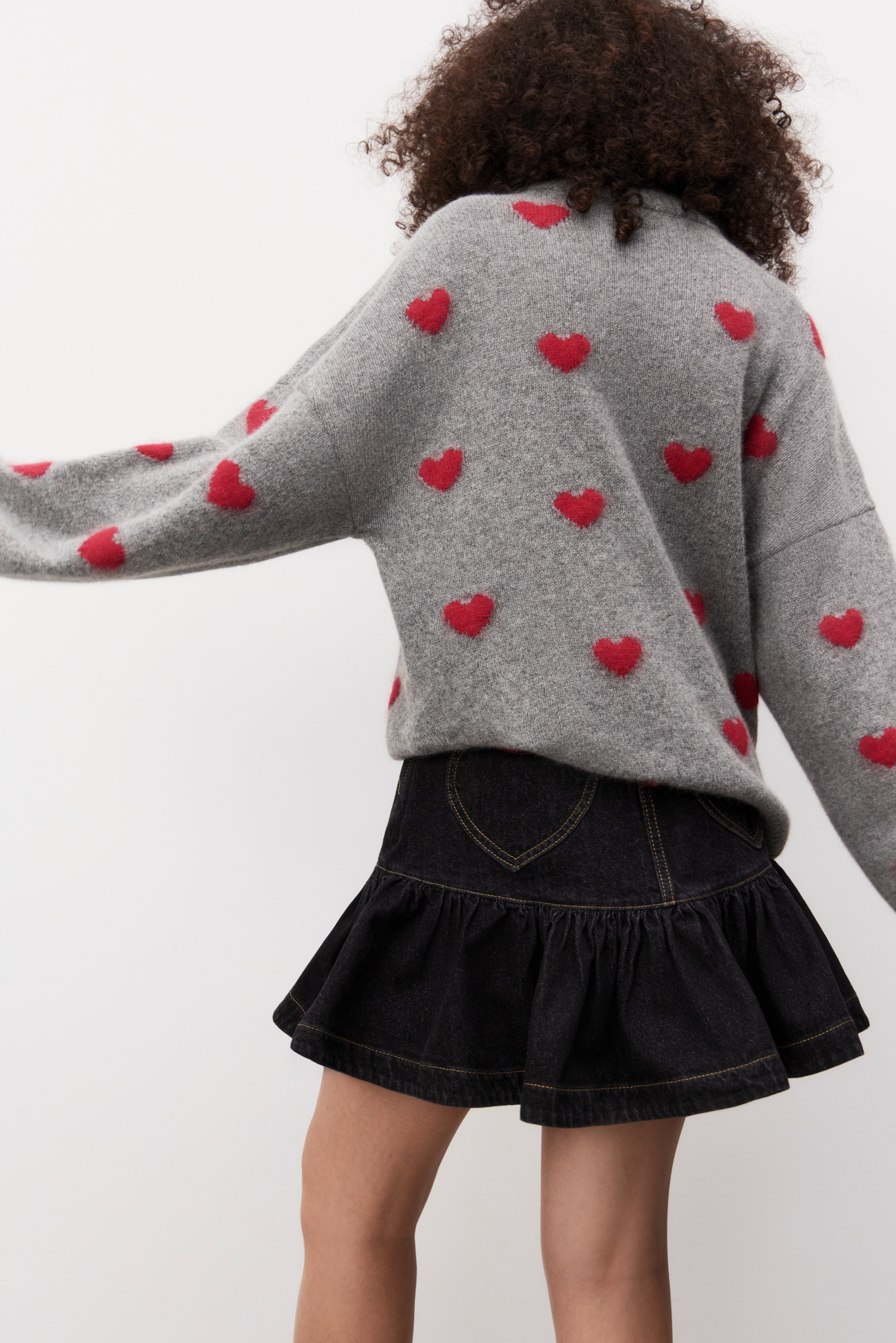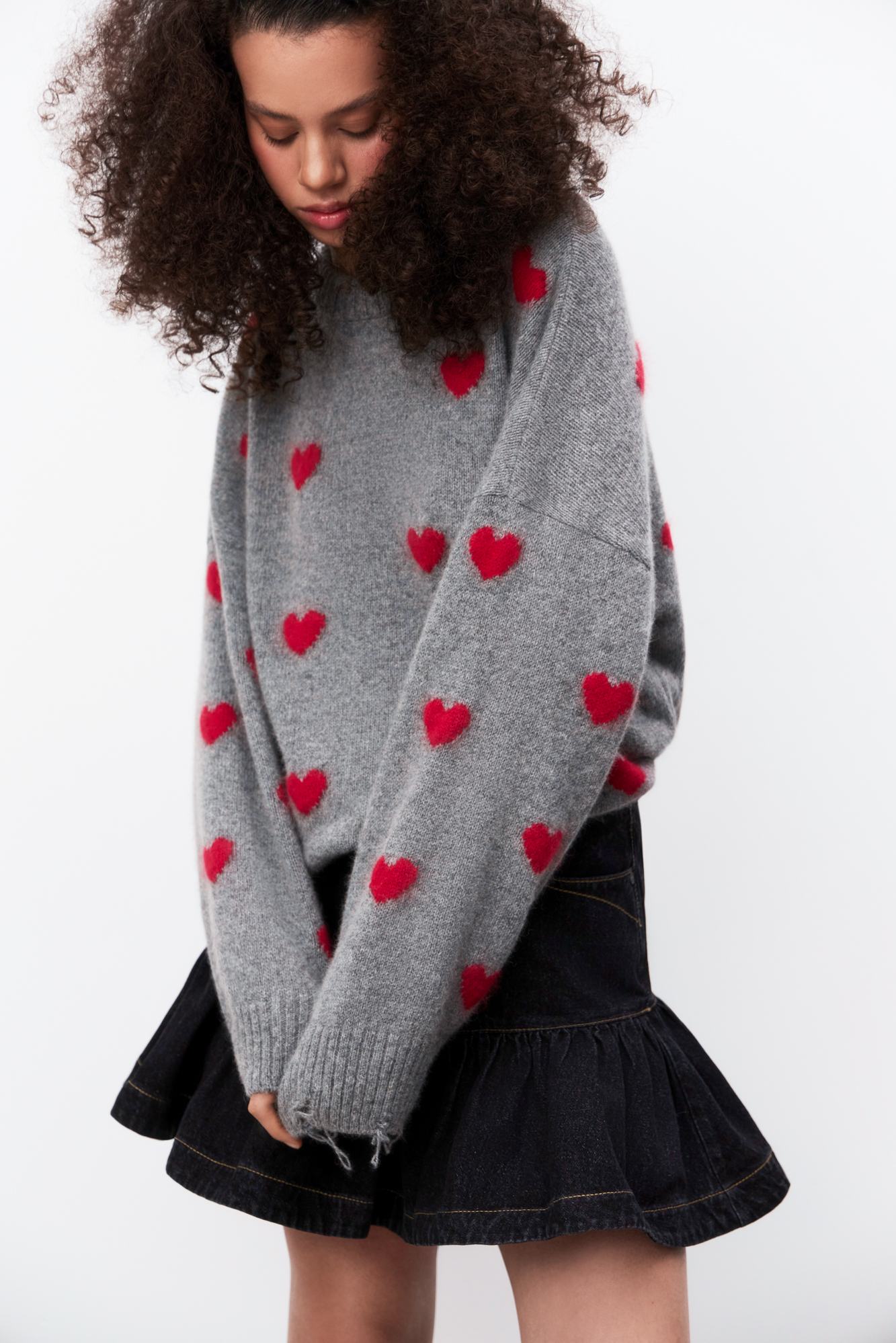 Джемпер из шерсти и пуха лисы с жаккардовым рисунком в виде сердечек. Модель свободного силуэта со спущенной линией плеч и круглым вырезом горловины. Манжеты рукавов и низ изделия выполнены в широкий рубчик с разрезами в стиле гранж.