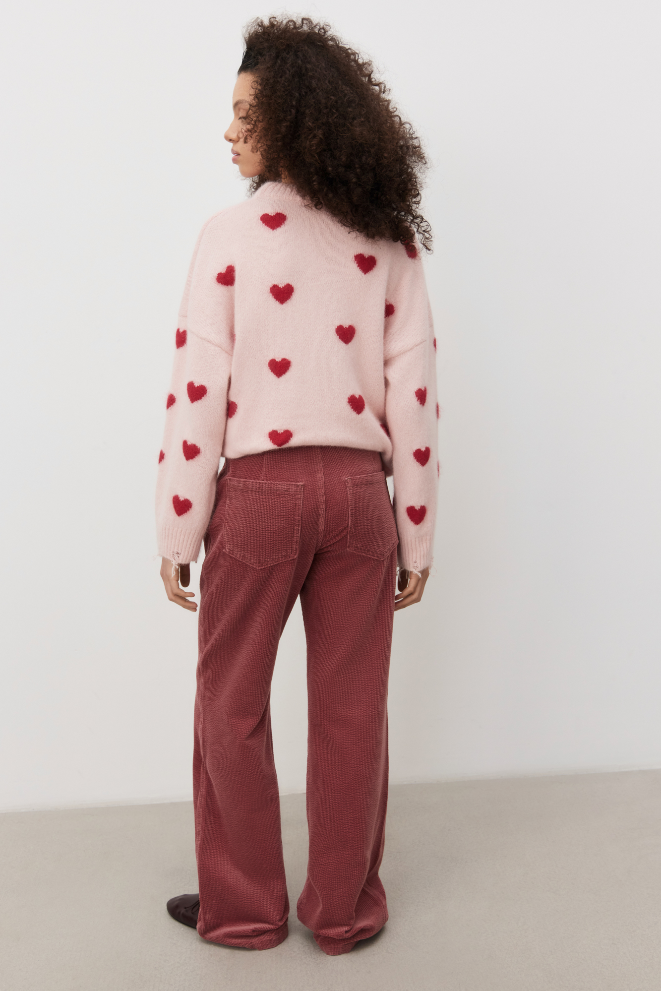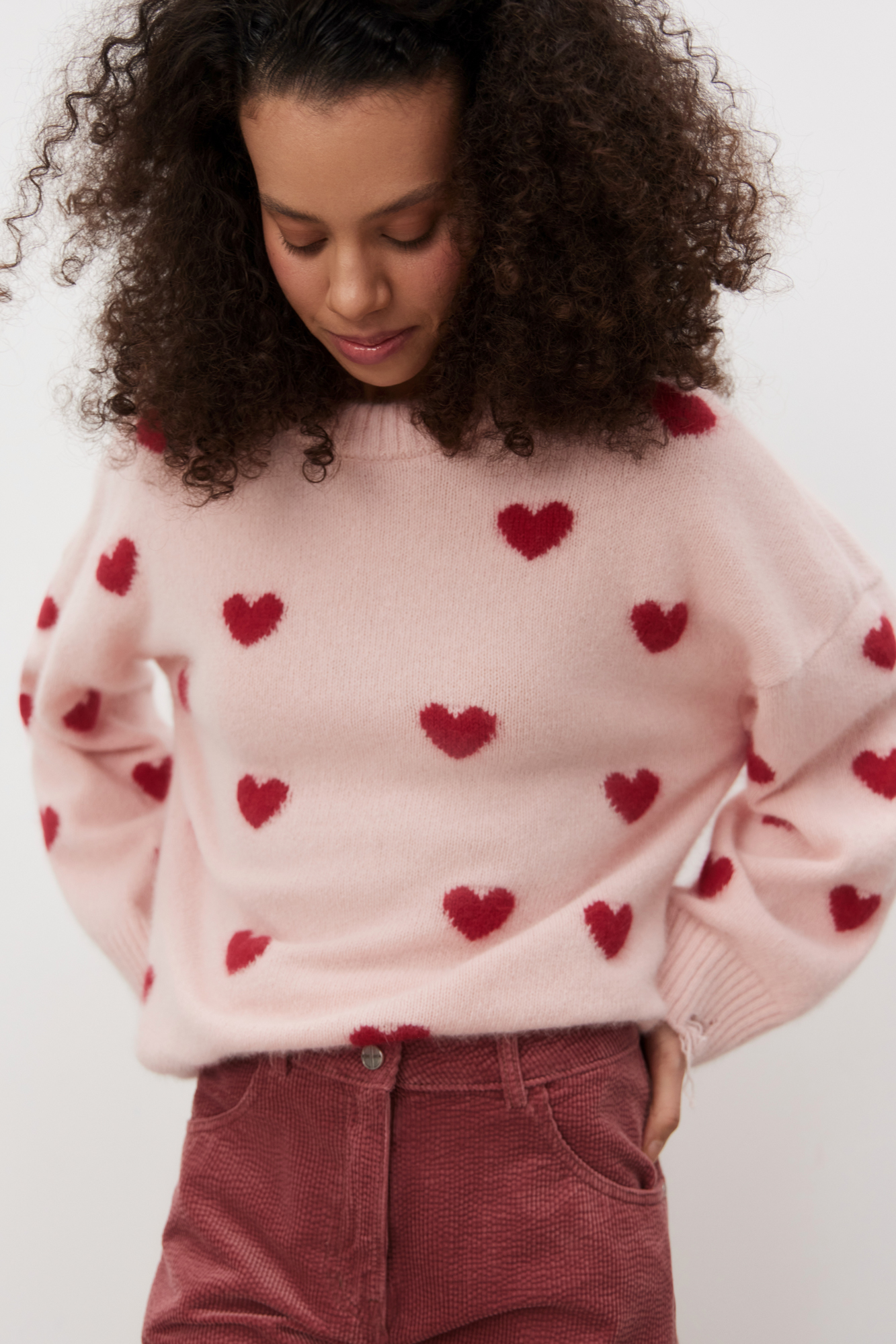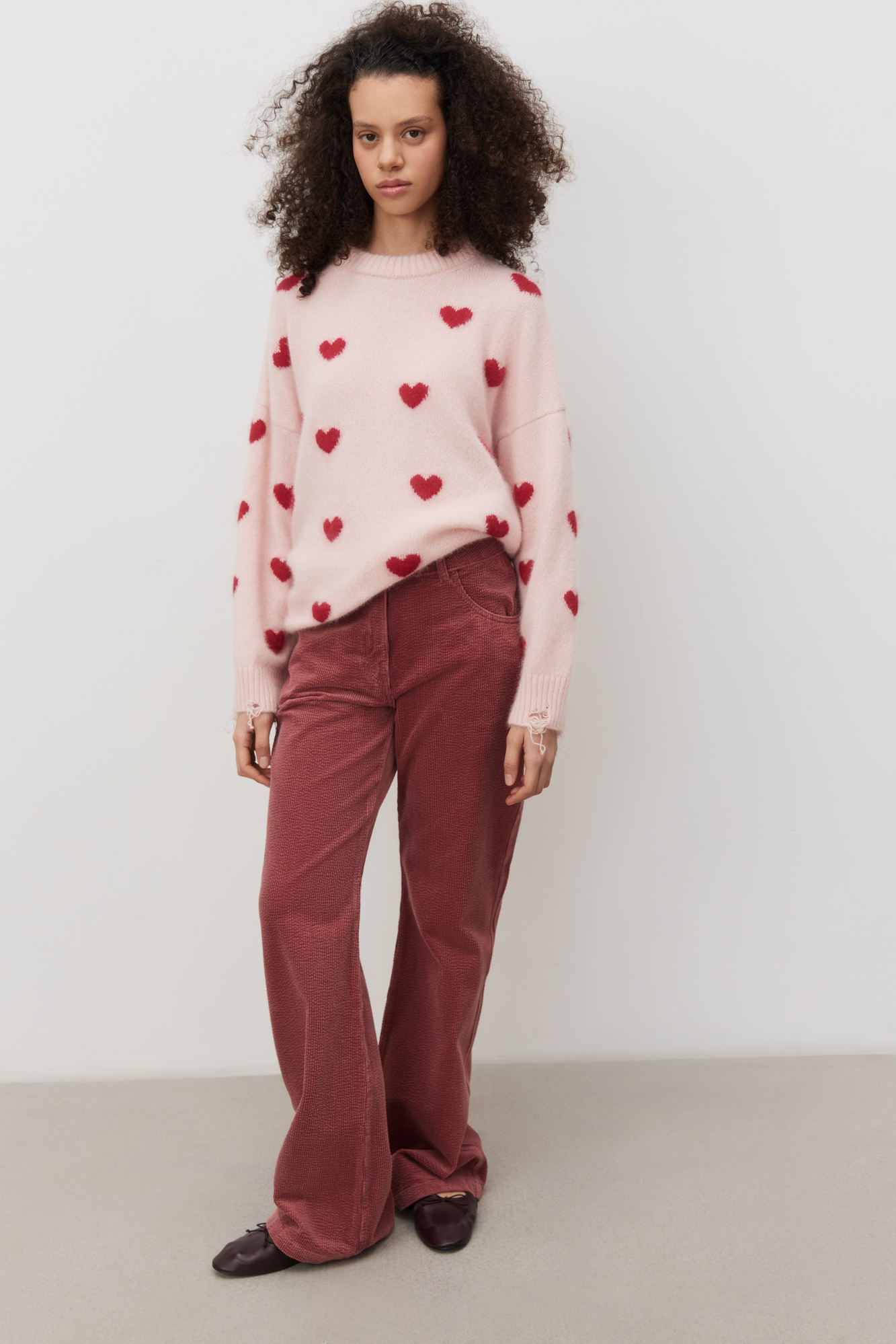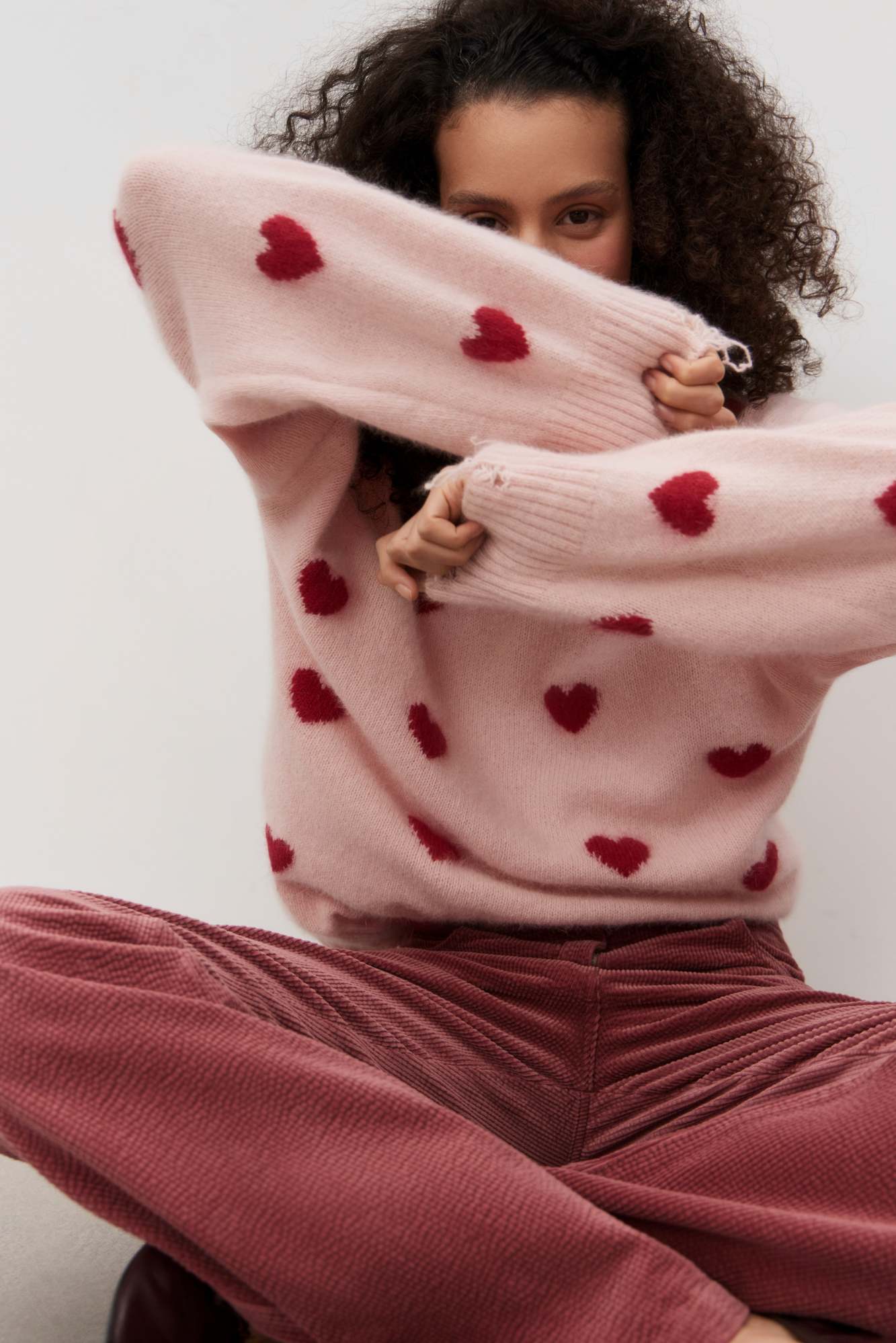 Джемпер из шерсти и пуха лисы с жаккардовым рисунком в виде сердечек. Модель свободного силуэта со спущенной линией плеч и круглым вырезом горловины. Манжеты рукавов и низ изделия выполнены в широкий рубчик с разрезами в стиле гранж.