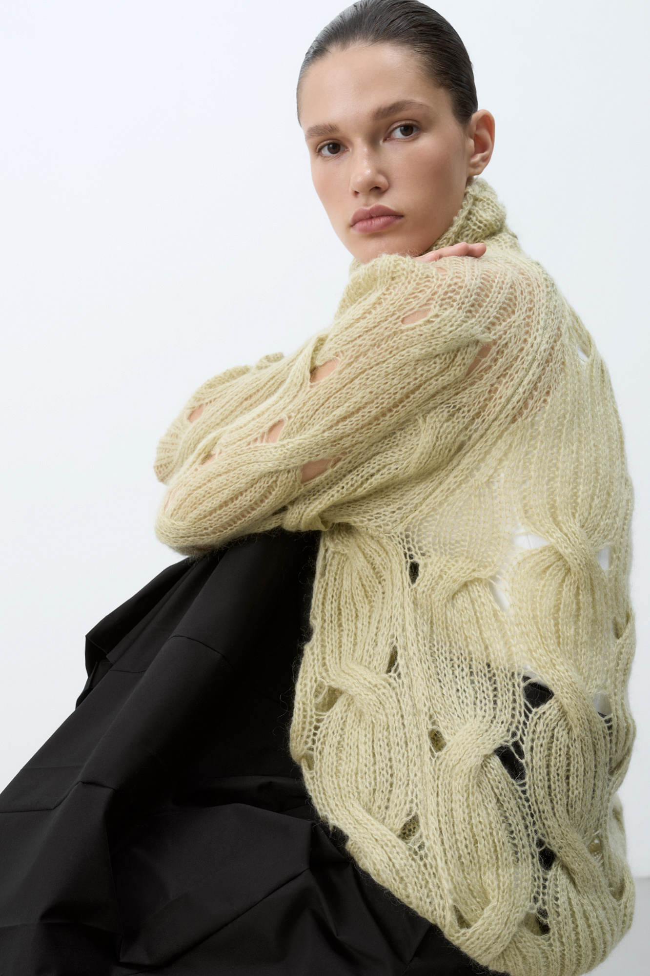 Объемный удлиненный джемпер с мохером, вязка выполнена крупными косами. Высокий ворот под горло. Манжеты рукавов и низ изделия на резинке.