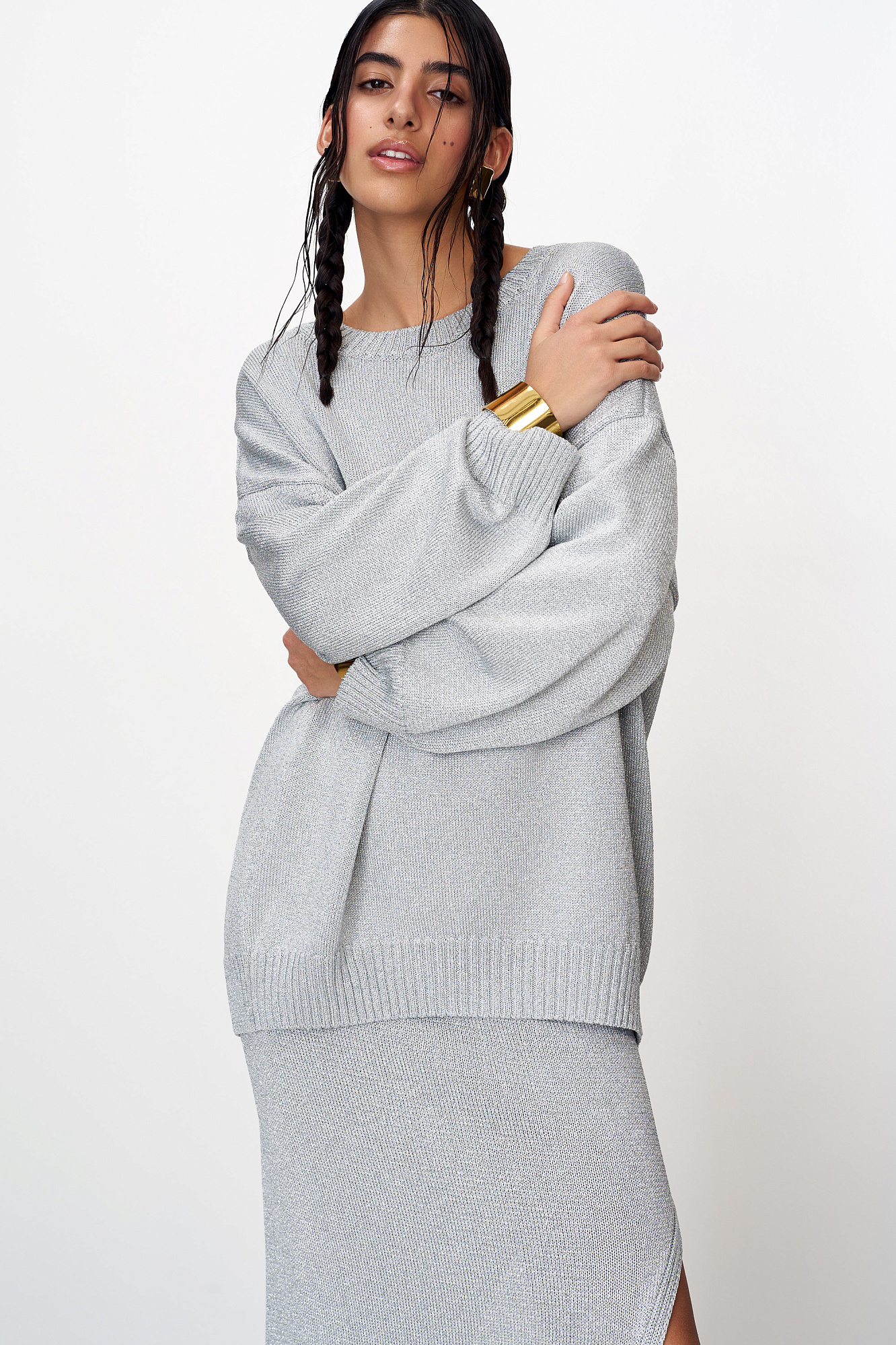 Трикотажный удлиненный джемпер из вискозы с люрексом. Модель свободного силуэта со спущенной линией плеча и круглым вырезом горловины. Края изделия в рубчик.