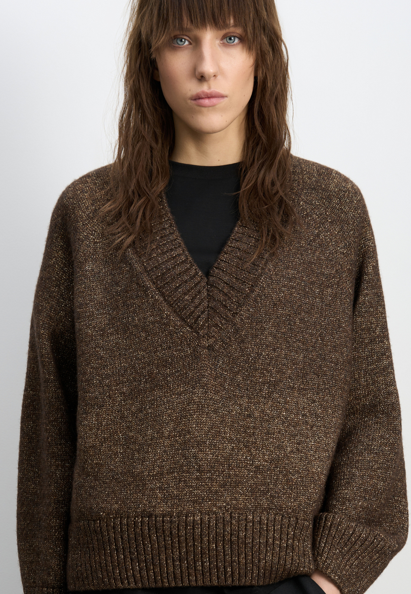 Трикотажный джемпер из шерсти мериноса с люрексом. Модель свободного силуэта с V-образным вырезом.
