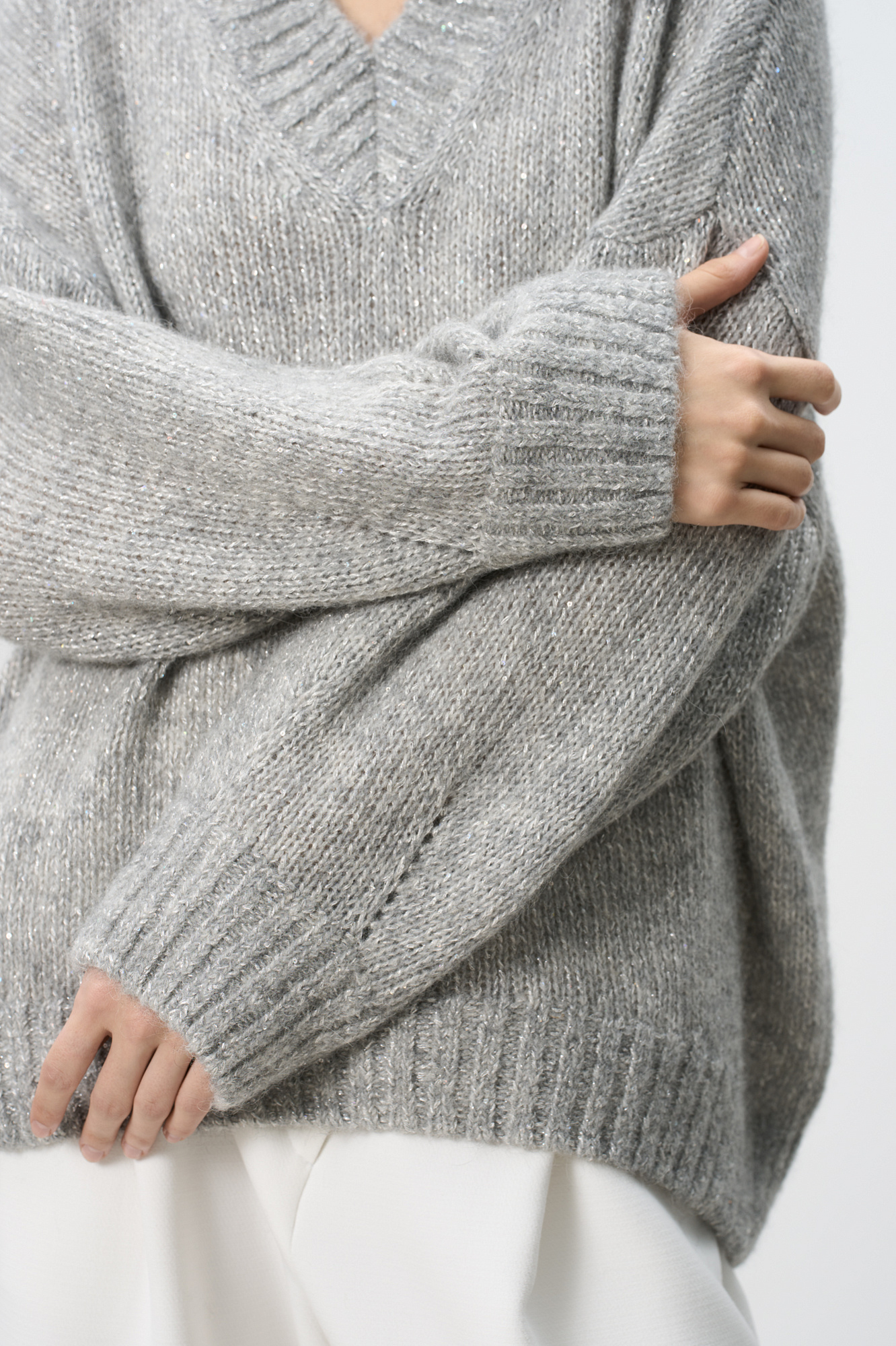 Трикотажный джемпер из шерсти альпака с добавлением люрекса. Модель с V-вырезом, спущенной линией плеча и декоративными сбавками на манжетах. Изделие декорировано пайетками.
