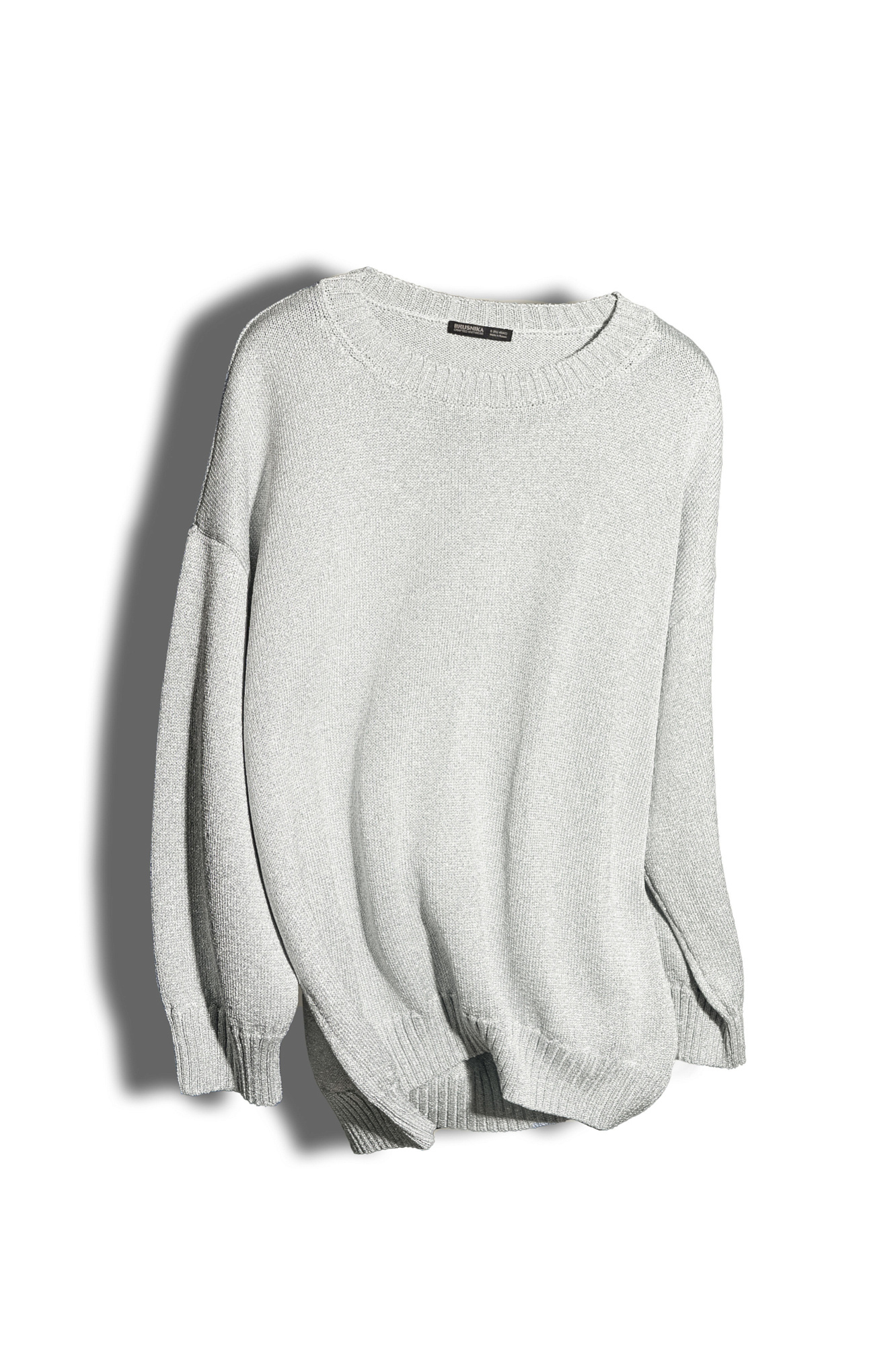 Трикотажный удлиненный джемпер из вискозы с люрексом. Модель свободного силуэта со спущенной линией плеча и круглым вырезом горловины. Края изделия в рубчик.