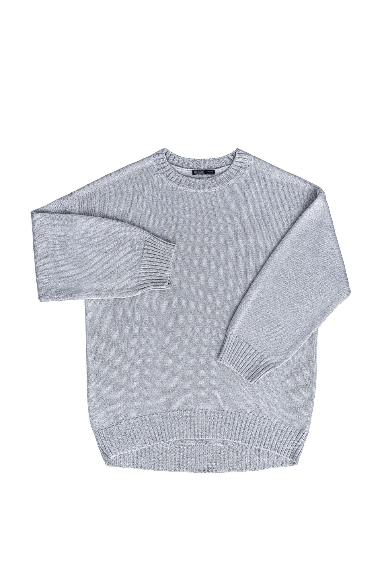 Удлиненный джемпер свободного силуэта со спущенной линией плеча и круглым вырезом, декорирован рубчиком по краям. Изделие выполнено из материала с эффектом металлического блеска.
