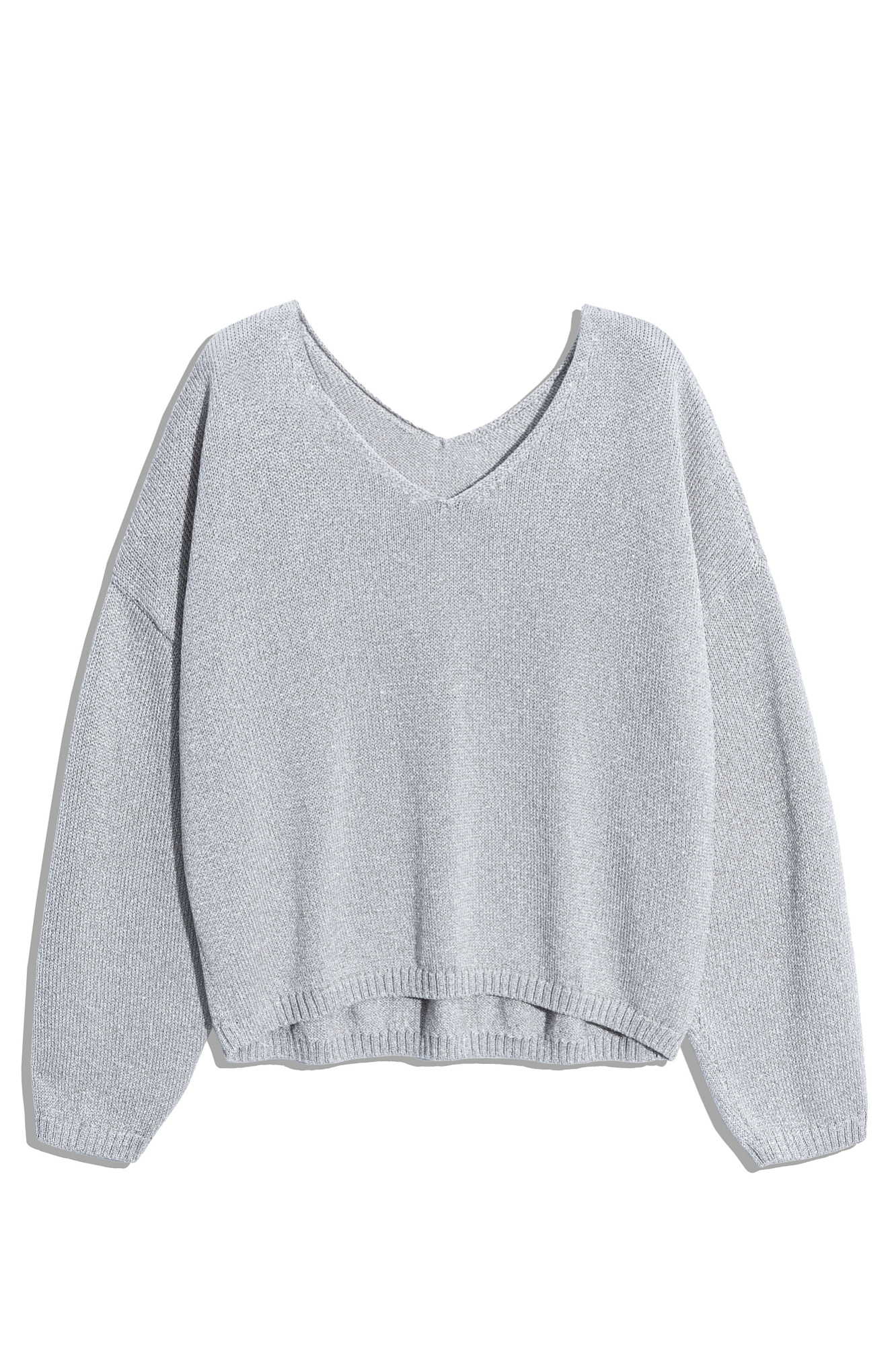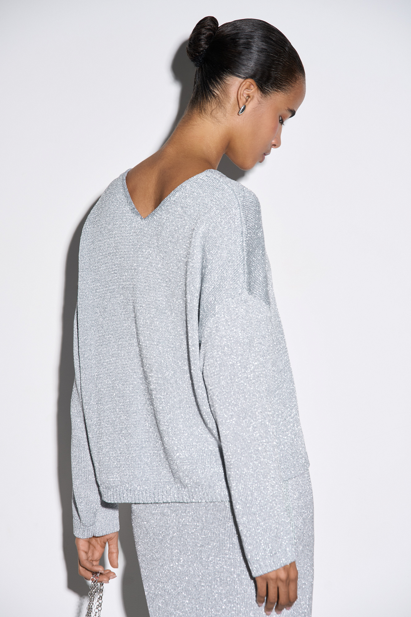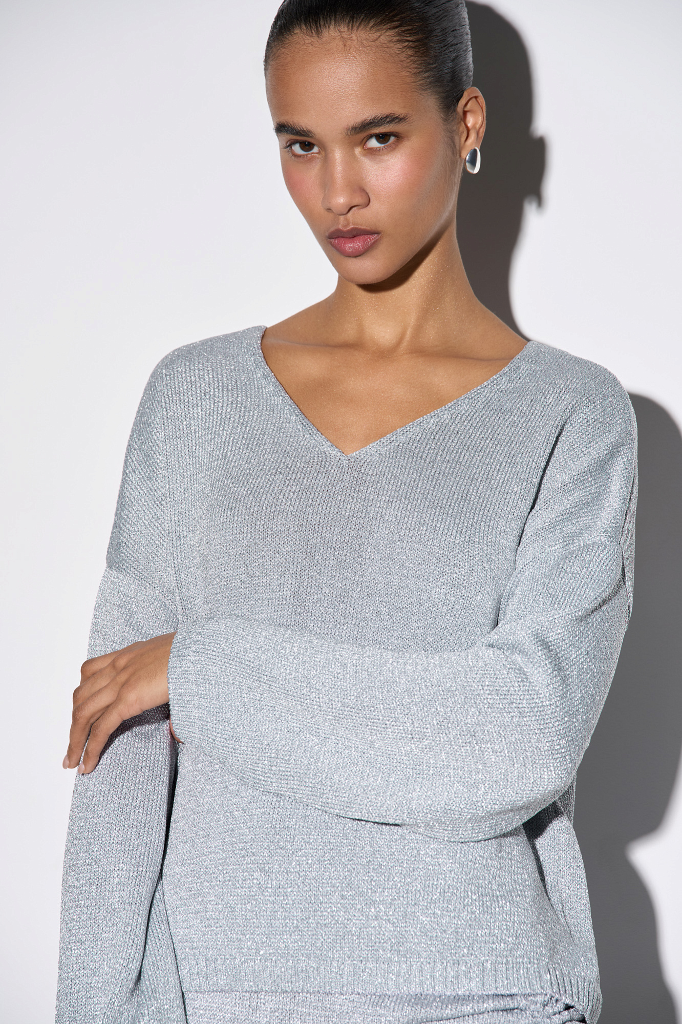 Джемпер из вискозы с добавлением люрекса. Модель свободного силуэта, со спущенной линией плеч и V-образным вырезом. Манжеты рукавов и низ изделия выполнены в рубчик.