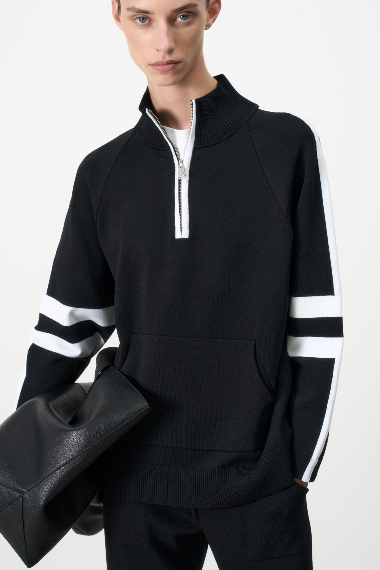 Джемпер из вискозы в спортивном стиле. Лампасы на рукавах. Высокий воротник. Застежка-молния.